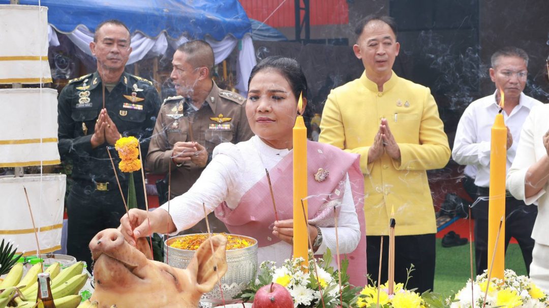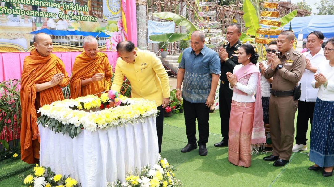 โดยมีพระรัตนากรวิสุทธิ์ รองเจ้าคณะจังหวัดสกลนคร ร่วมประกอบพิธีเจิมและประพรมน้ำพระพุทธมนต์ลงบนแผ่นศิลาฤกษ์ จากนั้นได้มีการตอกไม้มงคล 9 ชนิด วางอิฐทอง เงิน นาค และแผ่นศิลาฤกษ์ พร้อมโปรยอัญมณี พระสงฆ์เจริญชัยมงคลคาถา และผู้ร่วมพิธีโปรยข้าวตอกดอกไม้ ณ หลุมวางศิลาฤกษ์ เพื่อความเป็นสิริมงคล