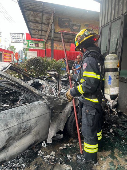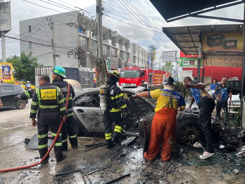 นายเอ (นามสมมุติ) อายุ 40 ปี พนักงานโรงงานประตูเหล็ก ผู้เห็นเหตุการณ์เล่าว่า ขณะนั่งพักอยู่หน้าโรงงาน ได้สังเกตเห็นควันลอยออกมาจากรถยนต์คันดังกล่าว ซึ่งทราบว่าเป็นรถของอู่ซ่อมรถข้างเคียงที่นำมาจอดไว้หน้าโรงงานเพื่อรอคิวซ่อม ตนจึงรีบเรียกช่างอู่มาดู แต่เมื่อเปิดประตูรถกลับมีควันฟุ้งเต็มห้องโดยสาร และเพียงไม่นานก็เกิดไฟลุกลามอย่างรุนแรง ใช้เวลาไม่ถึง 5 นาทีไฟได้เผาวอดทั้งคัน ตนเองตกใจกลัวว่าจะเป็นรถติดแก๊สและเกิดระเบิด จึงรีบวิ่งออกห่างจากจุดเกิดเหตุ