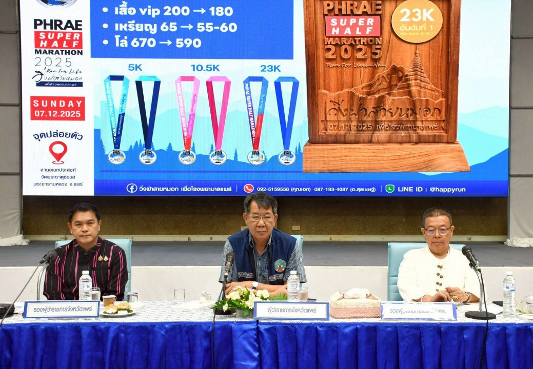 ที่ห้องประชุมแก้วโกศัย ชั้น 6 อาคารเฉลิมพระเกียรติ โรงพยาบาลแพร่ นายสมชัย เลิศประสิทธิพันธ์ ผู้ว่าราชการจังหวัดแพร่ เป็นประธานการประชุมเตรียมการจัดกิจกรรม “วิ่งฝ่าสายหมอก PHRAE SUPER HALF MARATHON 2025” โดยมี นายคุณากร คชหิรัญ และนายชัยสิทธิ์ ชัยสัมฤทธิ์ผล รองผู้ว่าราชการจังหวัดแพร่ พร้อมด้วยคณะกรรมการการจัดงานเข้าร่วมประชุม เพื่อระดมทุนจัดซื้ออุปกรณ์ทางการแพทย์ที่จำเป็นและเร่งด่วนสำหรับโรงพยาบาลแพร่ โดยเปิดโอกาสให้ประชาชนได้มีส่วนร่วมในการช่วยเหลือผู้ป่วย รายได้ทั้งหมดหลังหักค่าใช้จ่ายจะนำไปสมทบทุนเพื่อจัดหาอุปกรณ์ช่วยชีวิต เพื่อให้ผู้ป่วยได้รับการดูแลรักษาอย่างมีประสิทธิภาพและเท่าเทียม