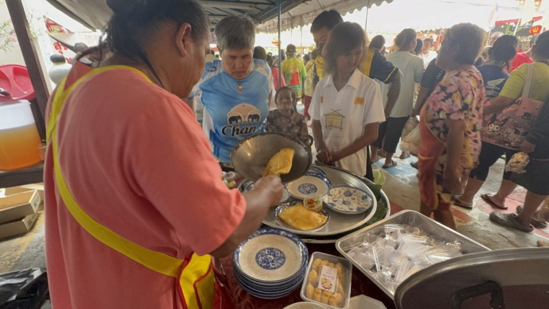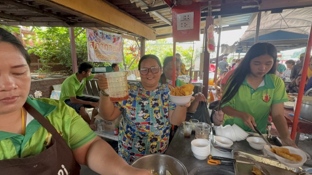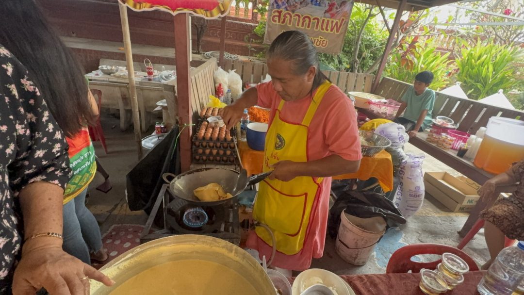 จากการสอบถาม นาย สุวิช สิทธิมานะชัย หรือออเก๋ วัย 48 ปี เล่าให้ฟังว่า วันนี้ได้นำขนมเบื้องญวนสูตรไข่โบราณมาร่วมงานบุญกฐิน เป็นขนมเบื้องญวนสูตรไข่โบราณ รับประทานคู่กับน้ำอาจาดอร่อยฟิน หากได้ลิ้มลองแล้วจะติดใจ เป็นสูตรโบราณจากคุณป้ารัตน์ ที่ได้ส่งต่อให้เจ๊เก๋ หรือออเก๋ สืบทอดขายสร้างรายได้เลี้ยงครอบครัว ส่วนผสมของขนมเบื้องญวน มีแป้งข้าวจ้าวผสมหัวกระทิ และแป้งกรอบเพิ่มความอร่อยด้วยงาขาว ตามด้วยไข่ไก่ เน้นที่ไส้เป็นสูตรเด็ดเคล็ดลับของทางร้าน โดยผัดใส้มะพร้าวหน้ากุ้งเป็นตัวชูโรง ซึ่งใช้มะพร้าวผัดกับกุ้งสับเป็นสูตรของเด็ดของทางร้าน เน้นไส้แน่นจนเป็นที่ติดใจของลูกค้า ตามด้วย เต้าหู้อย่างดี ไชโบ๊หวานอย่างดี ถั่วลิสงคั่วเองวันต่อวัน ถั่วงอก และต้องมีผักชีโรยหน้า รับประทานคู่กับน้ำอาจาด อร่อยลงตัว และมีกลิ่นที่หอมกรุ่นชวนรับประทาน