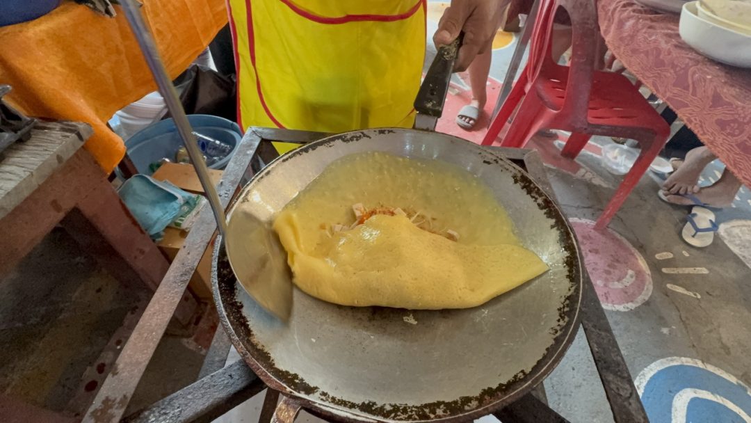 ขั้นตอนการทำโดยตั้งกระทะให้ร้อน ใส่น้ำพืชลงไปคนให้ทั่วกระทะ แล้วเทน้ำมันออกเหลือติดกระทะเพียงเล็กน้อย ตั้งบนเตาไฟอ่อน นำแป้งที่เตียมใว้ตักใส่ถ้วยผสมกับไข่ไก่ 1 ฟอง ตีให้เข้ากัน แล้วเทลงในกระทะแล้วใช้วิธีร่อนหรือเอียงกระทะไปรอบ ๆ เพื่อให้แป้งในกระทะบางและเป็นแผ่นใหญ่ ใส่ถั่วงอกตั้งไฟสักคู่ ก่อนมาเติมเครื่องเคียง มีไส้มะพร้าวหน้ากุ้ง เต้าหู้ ไชโบ๊หวาน และถั่วลิสงคั่ว แล้วนำกระทะไปตั้งไฟสักครู่