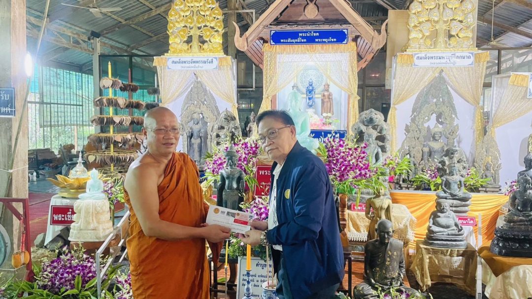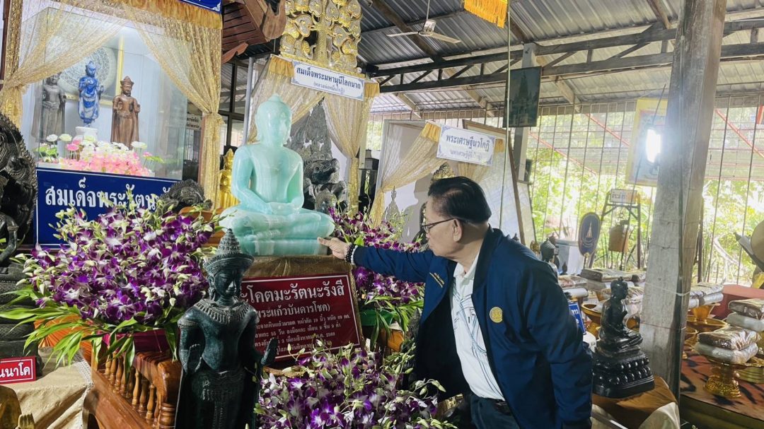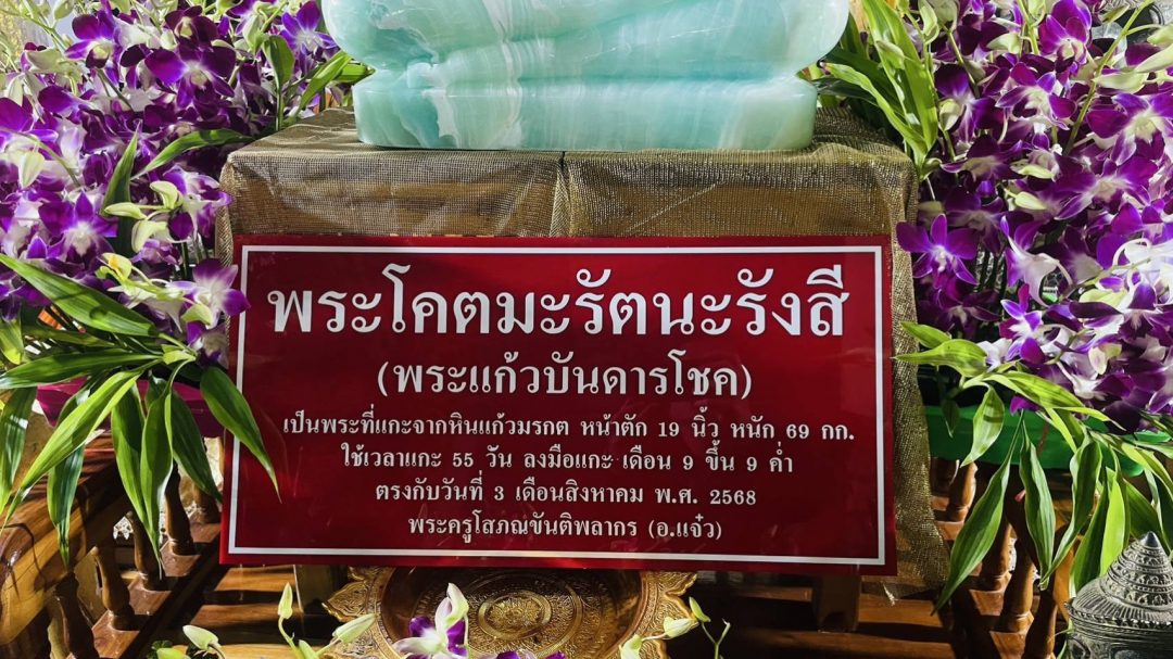 ทั้งนี้ยังได้มอบวัตถุมงคลให้แก่ ดร.นิยม เวชกามา เป็นแร่อุกกาบาตสีดำอัญมณีสีดำมีหลายชนิด เช่น แบล็กสปิเนล (นิล) ซึ่งเป็นที่รู้จักกันดี และยังมีความแข็งที่สูงกว่า โอนิกซ์ (Onyx) แกะสลักเป็นรูปวงรีทรงไข่ พร้อมมอบพระแกะสลักโคตมะรัตนะรังสี ทำจากบุษราคัม (Yellow Sapphire) พร้อมได้กราบพระสักการะพระแก้วบรรดารโชค เป็นพระที่แกะจากหินแก้วมรกต หน้าตัก 19 นิ้วน้ำหนัก 69 กิโลกรัม ใช้เวลาแกะ 55 ลงมือแกะในวันเดือน 9 ขึ้น 9 ค่ำ ตรงกับวันที่ 3 สิงหาคม 2568 ที่พระครูโสภณขันติพลากร (ทรงศักดิ์ ขนฺติโกงพระอาจารย์แจ๋ว) เจ้าอาวาสวัดถ้ำผาป่อง ดำริให้ก่อสร้างขึ้นมา ทั้งนี้มีคณะสงฆ์และประชาชนที่เลื่อมใสศรัทธาเข้าร่วมพิธีจำนวนมาก