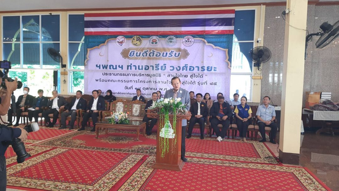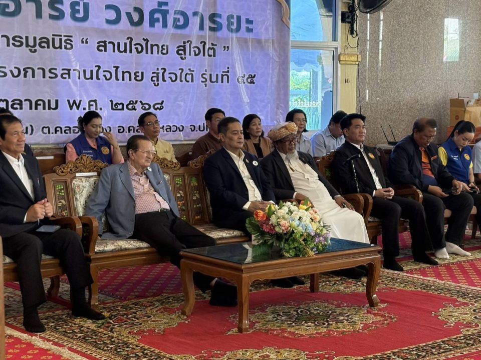 ส่วนทางด้านนายอารีย์ วงศ์อารยะ ประธานในพิธี ดำเนินการโครงการโครงการ “สานใจไทย สู่ใจใต้”กล่าวว่าด้วยโครงการ “สานใจไทย สู่ใจใต้” เกิดขึ้นจากดำริของ พลเอก เปรม ติณสูลานนท์ ประธาน องคมนตรีและรัฐบุรุษ โดยการสนับสนุนจากมูลนิธิรัฐบุรุษ พลเอก เปรม ติณสูลานนท์ มูลนิธิรักเมืองไทย และ มูลนิธิพิทักษ์อุทยานแห่งชาติเขาใหญ่ ร่วมกับกระทรวงศึกษาธิการ กระทรวงมหาดไทย ศูนย์อำนวยการ บริหารจังหวัดชายแดนภาคใต้ องค์การพิพิธภัณฑ์วิทยาศาสตร์แห่งชาติ และหน่วยงานที่เกี่ยวข้อง ตั้งแต่ปี พ.ศ.2548 ได้จัดกิจกรรมนำเยาวชนที่นับถือศาสนาอิสลามในพื้นที่จังหวัดชายแดนภาคใต้ 5 จังหวัด มาพำนักกับครอบครัวอุปถัมภ์ในกรุงเทพมหานคร และจังหวัดใกล้เคียง โดยคณะกรรมการดำเนินการ โครงการฯ ได้กำหนดจัดกิจกรรม รุ่นที่ 45 ระหว่างวันที่ 26 กันยายน – 28 ตุลาคม 2568 ในการดำเนินการครั้งนี้ เป็นการนำเยาวชนที่นับถือศาสนาอิสลาม และเยาวชนที่นับถือศาสนาพุทธ มาศึกษาเรียนรู้ศิลปวัฒนธรรม ขนบธรรมเนียมประเพณี และพำนักอาศัยอยู่กับครอบครัวอุปถัมภ์ ในพื้นที่ภาคกลางและพื้นที่จังหวัดฝั่งทะเลอันดามัน กรุงเทพมหานคร จังหวัดฉะเชิงเทรา ชลบุรี นครนายก นนทบุรี ปทุมธานี พระนครศรีอยุธยา สมุทรปราการ สระบุรี และจังหวัดอ่างทอง โดยกำหนดให้เยาวชน ที่นับถือศาสนาอิสลาม เข้าพำนักกับครอบครัวมุสลิม และเยาวชนที่นับถือศาสนาพุทธเข้าพำนักกับครอบครัวพุทธ และให้จังหวัดปทุมธานีพิจารณาและคัดเลือกครอบครัวอุปถัมภ์ที่จะเข้าร่วมโครงการดังกล่าว รวมทั้งจัดหาที่พัก ให้สำหรับบุคลากรและครูพี่เลี้ยงตามความเหมาะสม เพื่อให้การคัดเลือกครอบครัวอุปถัมภ์โครงการดังกล่าวของจังหวัดปทุมธานีต่อไป