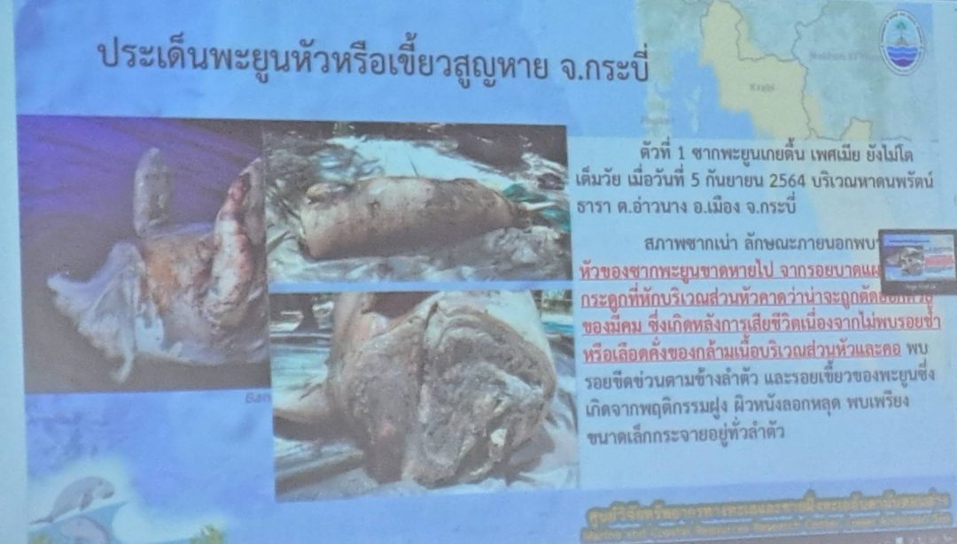 นายสุวิทย์ สุริยะวงค์ รองผู้ว่าราชการจังหวัดกระบี่ กล่าวว่า ตามที่ปรากฏว่า เมื่อวันที่ 5 ตุลาคม 2568 พบซากพะยูนตัวเต็มวัย ลักษณะภายนอกพบบาดแผลรอยเขี้ยวจากพฤติกรรมฝูงตามลำตัว และบาดแผลฉกรรจ์จากการถูกตัดด้วยของมีคม บริเวณส่วนหัวกลางกะโหลกศีรษะมีรอยแตก กะโหลกส่วนหน้า ขากรรไกรบนและล่างถูกตัดขาดสูญหายไป ลักษณะขอบแผลคม คาดว่าถูกตัดหัวด้วยของมีคมหลังจากพะยูนตายแล้ว เกยตื้นบริเวณหน้าหาดบ้านหลังเกาะ หมู่ที่ 7 ตำบลเกาะศรีบอยา อำเภอเหนือคลอง จังหวัดกระบี่ ซึ่งพะยูนเป็นสัตว์ป้าสงวนจำพวกสัตว์เลี้ยงลูกด้วยนม ลำดับที่ 6 ตามบัญชีสัตว์ป้าสงวน แนบท้ายพระราชบัญญัติสงวนและคุ้มครองสัตว์ป่า พ.ศ. 2562 และที่แก้ไขเพิ่มเติม นั้น
