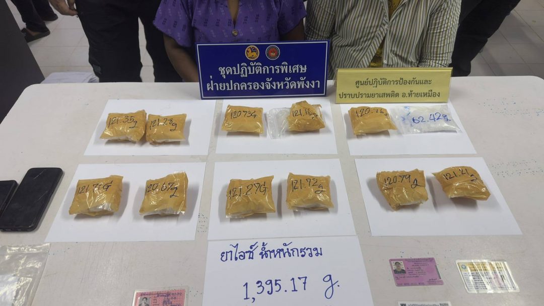 โดยการจับกุมได้ในครั้งนี้ด้วยชุดปฏิบัติการพิเศษฝ่ายปกครองจังหวัดพังงา ได้แจ้งจากสายลับประกอบกับข้อมูลจากการจับกุมคดียาเสพติดที่ผ่านมาว่า ในวันที่ 22 ต.ค. 2568 จะมีการลักลอบขนยาเสพติด (ยาไอซ์) มากับรถทัวร์โดยสารจำนวนหนึ่งจากประเทศเมียนมาเข้ามาในพื้นที่ของ จ.พังงา ผ่านอำเภอคุระบุรี อำเภอตะกั่วป่า โดยมีจุดหมายที่ ต.ลำแก่น อ.ท้ายเหมือง จ.พังงา ต่อมาเจ้าหน้าที่ฝ่ายปกครองจังหวัดพังงา จึงได้ลงพื้นที่มาถึง บขส.อ.ตะกั่วป่า เพื่อซุ้มสังเกตการณ์ผู้โดยสารที่เดินทางมาด้วยรถทัวร์ จนเมื่อเวลาประมาณ 16.00 น. เจ้าหน้าที่ได้พบบุคคลต้องสงสัย 2 คน เดินลงมาจากรถทัวร์ชุมพร-ภูเก็ต จึงแสดงดูเป็นเจ้าหน้าที่ที่ฝ่ายปกครอง ขออนุญาตตรวจค้นจนสามารถพบยาไอซ์จำนวน 12 ถุง แอบซุกซ่อนในชุดชั่นใน ทางเจ้าหน้าที่ฝ่ายปกครองจึงได้จับกุมตัวผู้ 2 ราย พร้อมนำยาไอซ์ที่พบทั้งหมดไปชั่งที่ร้านทองแห่งหนึ่ง รวมน้ำหนักรวมถุง 1,395.17 กรัม มูลค่า 2 ล้านบาท จากนั้นจึงควบคุมตัวผู้ต้องหาทั้ง 2 ราย พร้อมของกลางและเอกสารต่างๆลงบันทึกจับกุมพร้อมแจ้งข้อกล่าวหาว่าร่วมกันจำหน่ายยาเสพติดให้โทษประเภทที่ 1 เมทแอมเฟตามีน (ยาไอซ์) โดยมีไว้ในครอบครองเพื่อจำหน่าย โดยไม่ได้รับอนุญาต อันเป็นการก่อให้เกิดการแพร่กระจายในกลุ่มประชาชน ที่เกี่ยวข้องส่งให้ พนักงานสอบสวน สภ.ตะกั่วป่า เพื่อดำเนินคดีตามกฎหมายต่อไป