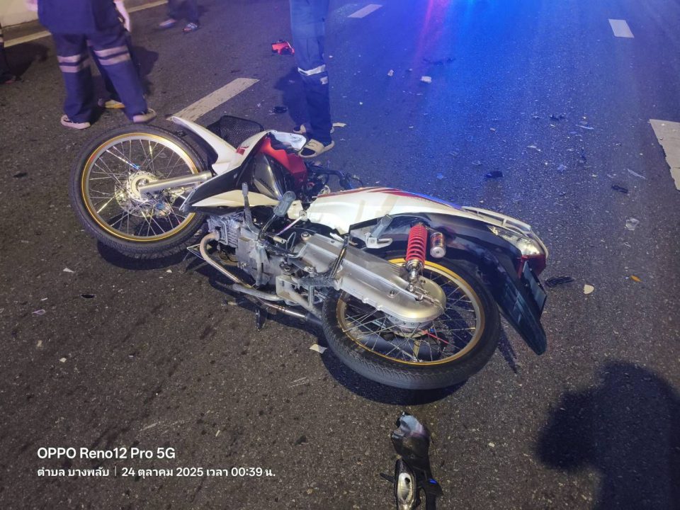 คนขับรถบรรทุกพ่วง 22 ล้อ เล่าว่า เหตุเกิดประมาณ 00.30 น. ตนขับรถบรรทุกยางมะตอย หนัก 26 ตัน มาจากบางประกง กำลังขับไปส่งที่กาญจนาภิเษก ขณะกำลังขับรถขึ้นสะพานอยู่เลนซ้าย แต่จังหวะที่ขึ้นสะพานรถบรรทุกมีน้ำหนักจึงต้องชะลอตัวช้าลง หลังจากนั้นตนได้ยินเสียงดังตู้มบริเวณด้านหลัง จึงหันไปดูปรากฏว่ามีรถจยย.มาชนท้ายด้านขวา หลังจากนั้นตนจึงขับรถเลยออกไปทิ้งระยะไว้ เพราะกลัวว่ารถคันหลังจะวิ่งขึ้นมาเกิดเหตุซ้ำเพราะเป็นทางขึ้นสะพาน หลังจากที่ตนจอดรถตนได้เดินกลับย้อนไปดู พบว่าเขานอนหมดสติไม่รู้เรื่องแล้ว และคาดว่าคงขับขี่รถจยย.มาเร็วมากๆ เพราะชนท้ายรถดังและแรง