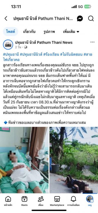 จากกรณีเพจ“ปทุมธานีนิวส์”ได้ลงโพสต์ร้องเรียนโดยมีใจความว่า“ลูกสาวร้องเรียนทางเพจเรื่องของคุณแม่ขับรถ จยย.ไปธุระถูกรถเกี่ยวข้าวขับสวนแล้วรถเกี่ยวข้าวดันไปเกี่ยวสายไฟหล่นลงมาพาดคอคุณแม่จนรถ จยย ล้มกระเด็นฟาดพื้นทำให้แม่ มีอาการเจ็บคอจากถูกสายไฟเกี่ยวคอทำให้กระดูกเชิงกรานหลังหักจนบัดนี้แพทย์แจ้งว่ายังไม่รู้ว่าจะสามารถกลับมาเดินได้เหมือนเดิมหรือไม่โดยทางญาติได้มีการติดต่อคู่กรณีไปแล้วแต่คู่กรณีกลับนิ่งเฉยไม่กลับมาดูแลทางญาติ เหตุเกิดเมื่อวันที่ 25 กันยายน เวลา 08.30.น.ที่ผ่านมาทางญาติเกรงว่าผู้เป็นแม่จะ ไม่ได้รับความเป็นธรรมต่อเรื่องดังกล่าวเดี๋ยวแอดมินเพจจะลงพื้นที่หาข้อมูลแล้วเสนอข่าวให้ทราบต่อไปนั้น”
