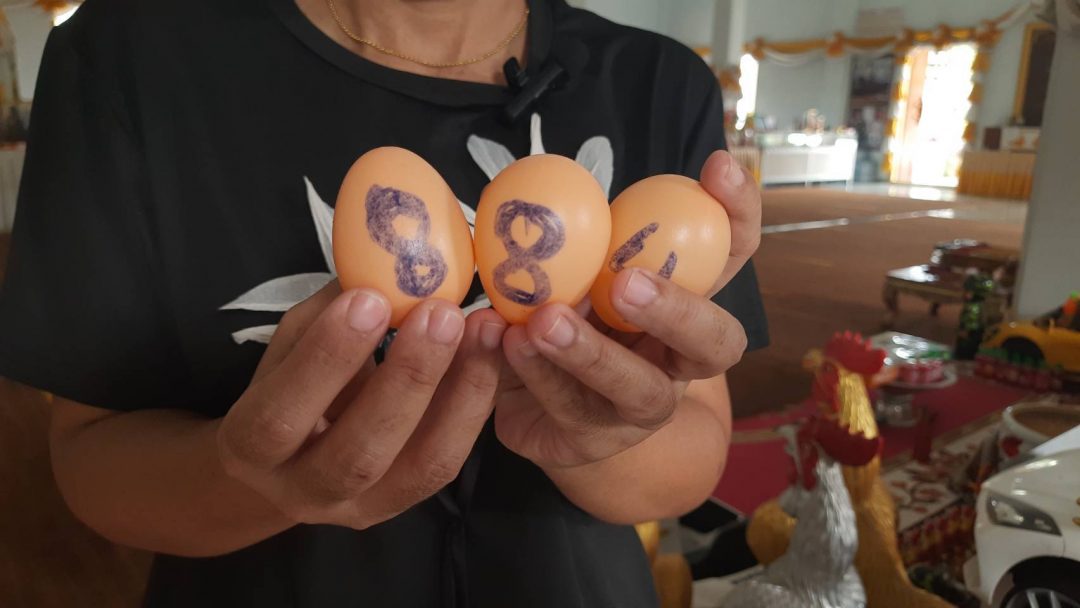 หลังจากที่ได้เจิมรถเสร็จแล้ว ตนเองก็ได้เดินขึ้นไปบนวิหารเพื่อขอพรกับไอ้ไข่วัดบึงบา ตนอธิฐานไว้ว่าขอให้ตนเองมีโชคลาภแล้วจะนำเงินมาทำบุญหลังจากขอพรไอ้ไข่วัดบึงบาเสร็จตนเองก็เดินหาซื้อล็อตเตอรี่แต่ไม่มีเลข 3 ตัวที่ตรงกับเลขป้ายทะเบียนรถของตนเลย ตนจึงตัดสินใจซื้อแค่เลขท้าย 2 ตัวของป้ายทะเบียนรถแทน ผลปรากฎว่าหลังจากผลสลากออกตนก็ถูกรางวัลที่ 4 จำนวน 1 ใบได้เงินมาหลายหมื่นบาท ตนจึงนำเงินบางส่วนไปร่วมงานกฐินที่วัดจัดขึ้น แล้ววันนี้ตนเองจึงเดินทางมาแก้บนดังกล่าวและก่อนกลับได้ล้วงลูกบอลในไหเงินไหทองได้เลข 884 กลับไปลุ้นโชคอีกครั้ง