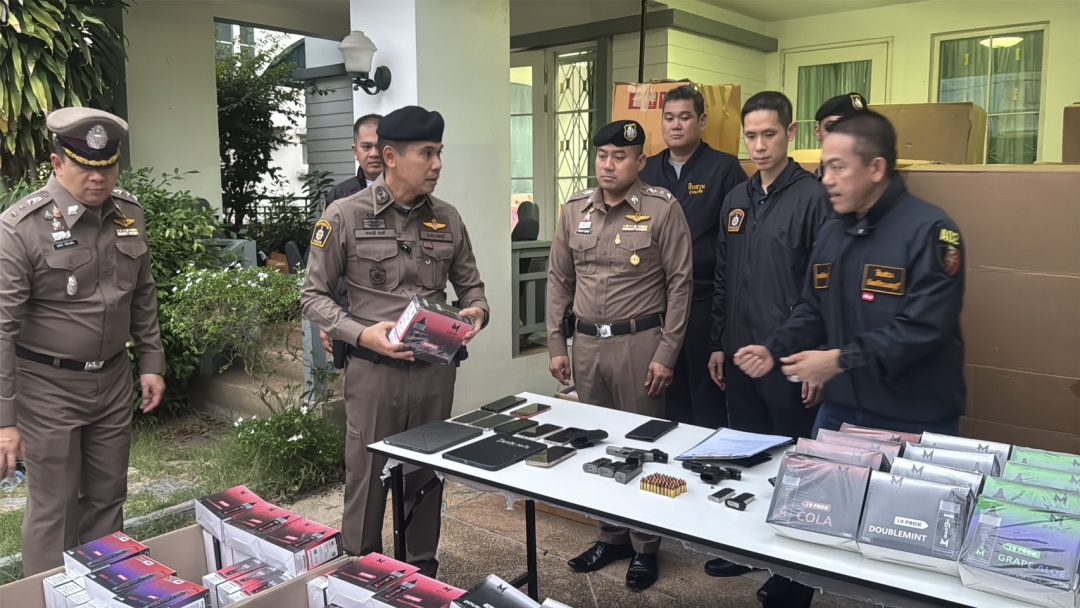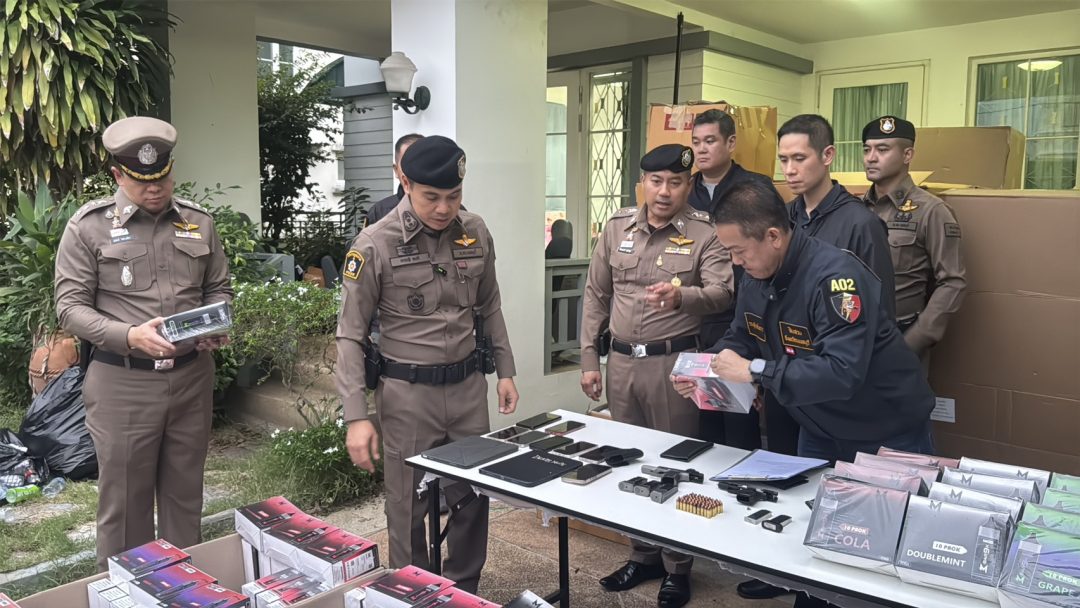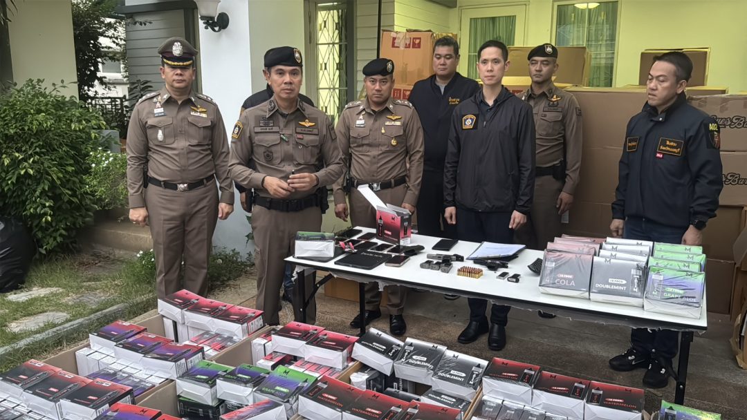 จากการตรวจค้นบ้านเดี่ยว 2 ชั้น พื้นที่ใช้สอยประมาณ 180 ตารางเมตร เจ้าหน้าที่พบของกลางเป็นบุหรี่ไฟฟ้าและน้ำยาบุหรี่ไฟฟ้าจำนวนประมาณ 70,000–80,000 ชิ้น รวมมูลค่าประมาณ 24,000,000 บาท พร้อมอาวุธปืนพกสั้น 2 กระบอก ได้แก่ 1.ปืนพกสั้น Sig Sauer รุ่น P365 ขนาด 9 มม. จำนวน 1 กระบอก 2.ปืนพกสั้น Sig Sauer รุ่น P938 ขนาด 9 มม. จำนวน 1 กระบอก พร้อมเครื่องกระสุนปืนอีกหลายรายการ รวมทั้งโทรศัพท์มือถือ 8 เครื่อง