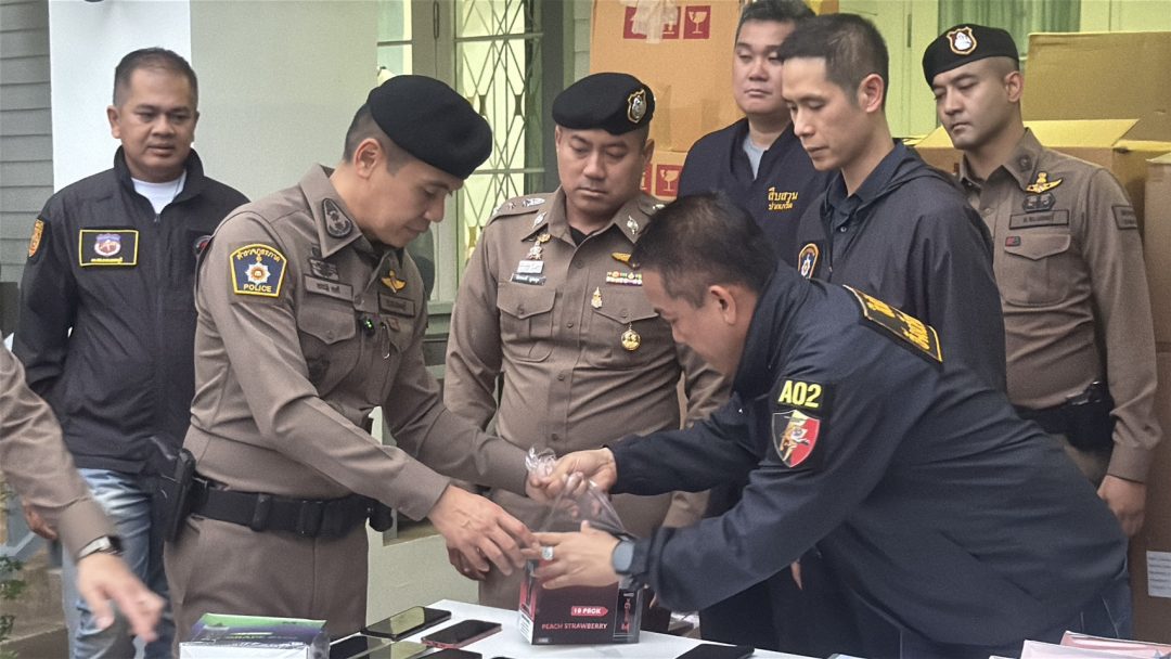 พล.ต.ต.อรรถพล อนุสิทธิ์ รอง ผบช.ภ.1, พล.ต.ต.เดชรพี คงดี ผบก.ภ.จว.นนทบุรี, พ.ต.อ.จิรายุส วานิชกูล ผกก.สส.ภ.จว.นนทบุรี และ พ.ต.ท.ศุภชัย ศรีศักดิ์ รอง ผกก.สส.ภ.จว.นนทบุรี พร้อมเจ้าหน้าที่ตำรวจ สภ.ปากเกร็ด และหน่วยปฏิบัติการพิเศษ (นปพ.) ภ.จว.นนทบุรี นำกำลังเข้าตรวจค้นบ้านหรูภายในหมู่บ้านแห่งหนึ่งริมถนนเลียบคลองประปา ตำบลบางตลาด อำเภอปากเกร็ด จังหวัดนนทบุรี ตามหมายค้นศาลจังหวัดนนทบุรี หลังได้รับรายงานว่ามีการลักลอบจำหน่ายบุหรี่ไฟฟ้าในพื้นที่
