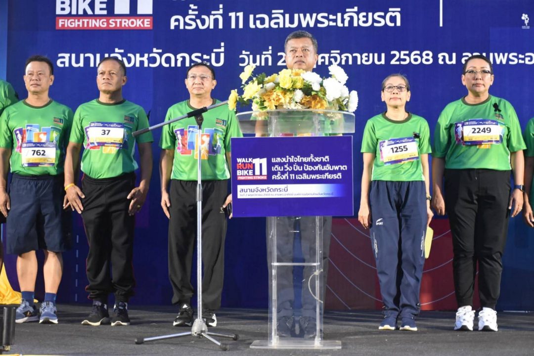 วันที่ 2 พฤศจิกายน 2568 เวลา 06.00 น. จังหวัดกระบี่ ได้จัดโครงการแสงนำใจไทยทั้งชาติ เดิน วิ่ง ปั่น ป้องกันอัมพาต ครั้งที่ 11 เฉลิมพระเกียรติ “ออกกำลังกายเป็นนิสัย ห่างไกลสโตรค” มีนายรัฐศาสตร์ ชิดชู ผู้ว่าราชการจังหวัดกระบี่ เป็นประธานเปิดโครงการ มีหัวหน้าส่วนราชการ ผู้สมัครและผู้ที่สนใจเข้าร่วมกิจกรรมเกือบ 2,000 คน จากผู้ที่สมัครจำนวน 2,804 คน ณ ลานพระอาทิตย์ องค์การบริหารส่วนจังหวัดกระบี่