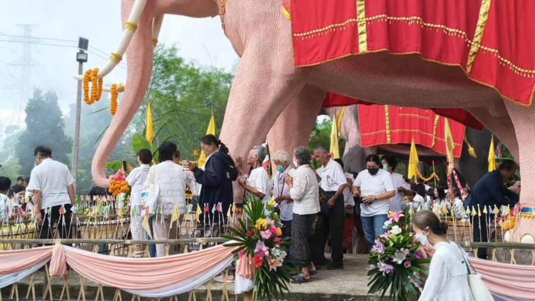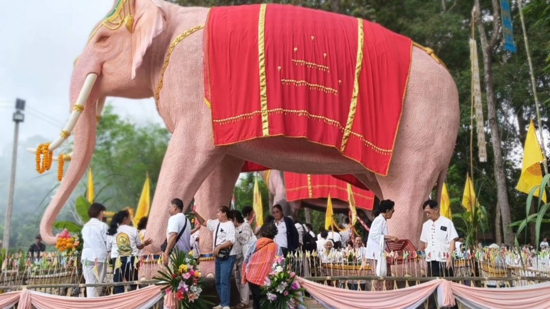 ชาวบ้านแตกตื่นฮือฮาในงานบุญทอดกฐินประจำปี ณ วัดพระธาตุมุงเมือง ตำบลเจริญราษฎร์ อำเภอแม่ใจ จังหวัดพะเยา หลังมีพิธีอันยิ่งใหญ่ ถวายช้างคู่ประตูวัดเพื่อเป็นสิริมงคลแก่พุทธศาสนิกชนและวัด โดยช้างทั้งสองเชือกมีความงดงามอลังการ สื่อถึงความรุ่งเรืองและอำนาจแห่งบารมีช้างเชือกซ้ายมีชื่อว่า “พระญาปราบหงสา เจ้าพระยาไชยานุภาพ” สีเทาดำ ขนาดสูงกว่า 4.50 เมตร งวงงาชูขึ้นอย่างสง่างาม ส่วนช้างเชือกขวาคือ “ปลูจาครี ช้างของพ่อขุนราม” สีชมพูงดงาม ขนาดเท่ากัน ม้วนงวงเข้าหาตัว แสดงถึงความอ่อนน้อมและทรงพลัง ทั้งสองประดิษฐานโดดเด่นบริเวณประตูหน้าวัด ท่ามกลางการตกแต่งด้วยผ้าสีแดงทองอร่ามตา