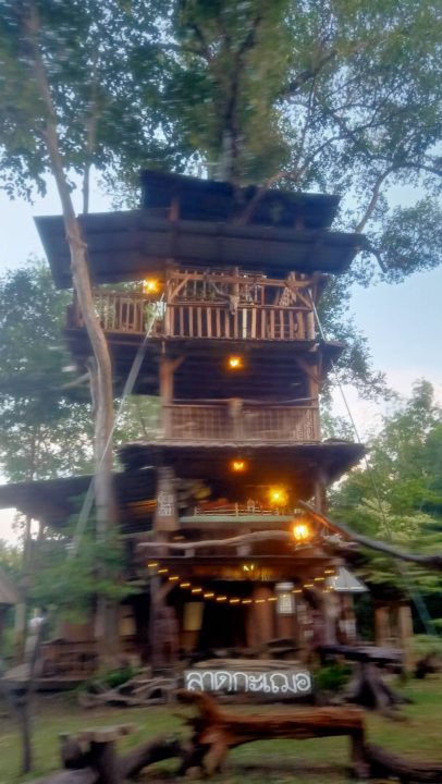 ต้นกระบกใหญ่ 3 คนโอบที่เห็นอยู่นี้ เป็นไม้ยืนต้น คือที่มาของการสร้างบ้านบนต้นไม้ สูง 6 ชั้นซึ่งนายวงยศ จินดาทะจักร ผอ.ศูนย์วิจัยและพัฒนาพันธุ์สัตว์สกลนคร บอกว่าที่ดินได้มาซื้อที่ดินตรงนี้เมื่อ 10 กว่าปีที่แล้ว ในพื้นที่ 8 ไร่ ที่หมู่บ้านลาดกะเฌอ ต.ห้วยยาง อ.เมือง จ.สกลนคร ปลูกบ้านเพื่อใช้เป็นที่อยู่อาศัย จนมาเมื่อปี 2562 ที่ผ่านมาเกิดความคิดที่จะสร้างบ้านในต้นไม้ คือมีต้นกระบกขนาดใหญ่อายุกว่า 100 ปี จึงได้รวบรวมไม้จากดรือนเก่าเท่าที่พอหาได้ ทำการก่อสร้างบ้านบนต้นไม้ เริ่มแรกก็ทำชั้นเดียว ต่อมาก็ขยายออกไปเป็น 2-3 และ 4 ชั้น และ 6 ชั้น โดยชั้น 2 จะทำเป็นที่จัดเลี้ยง สัมมนา และสังสรรค์ จุคนได้ประมาณ 60 คน ไม้จะแน่นหนาไม่โยกคงทนแข็งแรง ชั้น 3,4,5,6, ก็เป็นที่นั่งชมวิว มองได้รอบทิศ 360 องศา