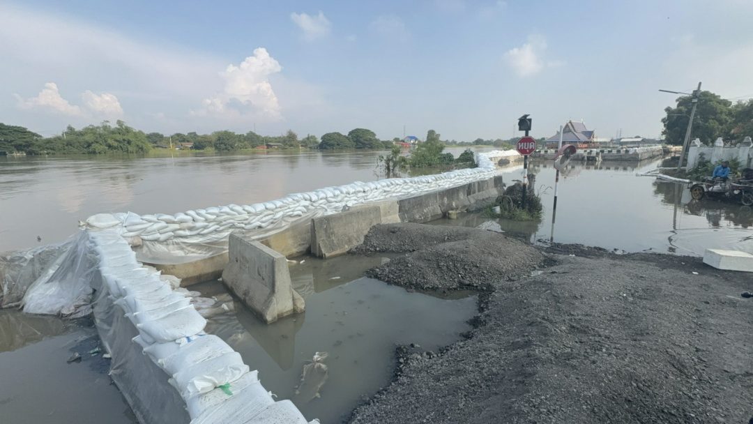 ที่บริเวณเขื่อนกั้นน้ำริมแม่น้ำเจ้าพระยา เทศบาลเมืองอ่างทอง อำเภอเมือง จังหวัดอ่างทอง ได้เร่งเสริมกระสอบทรายบนกำแพงเขื่อน ริมแม่น้ำเจ้าพระยาทั้ง 2 ฝั่ง เป็นระยะทางยาวหลายกิโลเมตร เพื่อรับสถานการณ์ที่เพิ่มขึ้นอย่างต่อเนื่อง เพื่อป้องกันเขตเศษฐกิจ ชุมชน ศูนย์การค้า และหน่วยงานราชการ หลังเขื่อนเจ้าพระยาระบายน้ำในอัตรา 2,800 ลบ.ม./วินาที และมีแนวโน้มเพิ่มมากขึ้น