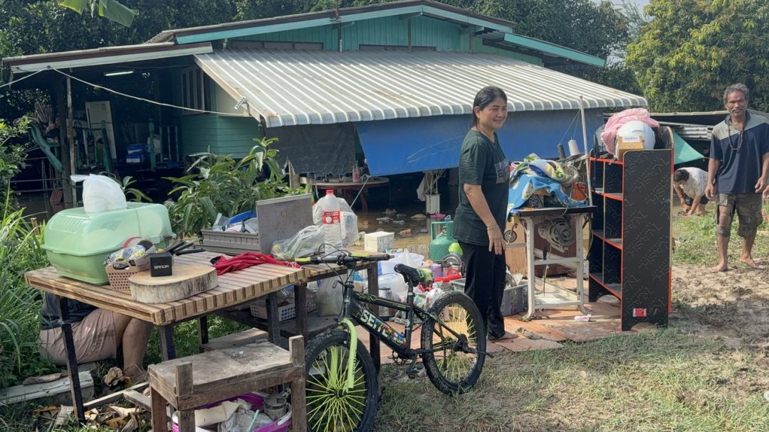 ที่บริเวณบ้านเลขที่ 189/8 หมู่ที่ 2 ตำบลป่าโมก อำเภอป่าโมก จังหวัดอ่างทอง ต้องขนของหนีน้ำกันอย่างวุ่นวาย หลังมวลน้ำได้ไหลทะลักเข้ามาทางด้านชุมชนเพิ่มสูงขึ้นอย่างต่อเนื่อง ทำให้เก็บข้าวของไม่ทันจมน้ำเสียหายไปจำนวนมาก ส่วนที่นำขึ้นมาไว้ด้านบนก็เปียกน้ำเสียหาย ด้าน นางสาวธารินี ฟองดา อายุ 49 ปี เจ้าของบ้าน เล่าให้ฟังว่า ตนเองได้ออกไปทำงานตามปกติ ได้มีญาติพี่น้องโทรตามว่าน้ำเข้ามาทางด้านหลัง ไหลเข้าท่วมบ้านสูงกว่า 1 เมตร แล้ว และสูงขึ้นอย่างต่อเนื่อง จึงเร่งมาช่วยกันเก็บข้าวที่จมน้ำเสียหายมาวางไว้ด้านบนที่สูง ส่วนทางด้าน นางสาวศิริรัตน์ ผึ้งคุ้ม อายุ 42 ปี บ้านเลขที่ 337/ข หมู่ที่ 2 ตำบลป่าโมก บอกว่าน้ำมาเร็วตั้งตัวไม่ทันก็จมน้ำเสียหาย คืนนี้ก็ต้องนอนในเต้นท์ข้างหน้าบ้าน