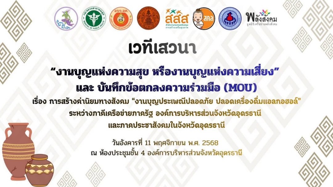 ทั้งนี้ การลงนาม MOU ดังกล่าว นับเป็นจุดเริ่มต้นของการสร้างวัฒนธรรม “งานบุญปลอดเหล้า” ในจังหวัดอุดรธานี เพื่อยกระดับสุขภาวะ ลดอุบัติเหตุ และสร้างแบบอย่างสังคมอีสานปลอดภัยอย่างยั่งยืน นอกจากการลงนาม MOU แล้ว ภายในงานยังมีเวทีเสวนาในหัวข้อ “งานบุญแห่งความสุข หรืองานบุญแห่งความเสี่ยง” เพื่อเปิดมุมมองและแลกเปลี่ยนความคิดเห็นจากหลายภาคส่วนถึงแนวทางการจัดงานบุญแบบสร้างสรรค์ ปลอดภัย และไม่ส่งเสริมการดื่มแอลกอฮอล์