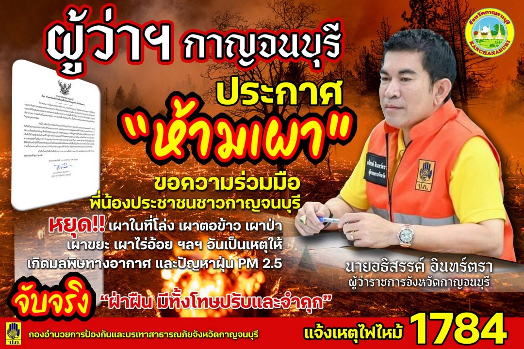 โดยให้ผู้อำนวยการอำเภอทุกอำเภอ ผู้บริหารองค์กรปกครองส่วนท้องถิ่นทุกแห่ง ผู้นำท้องที่ผู้นำชุมชน และหน่วยงานที่เกี่ยวข้อง ถือเป็นหน้าที่ที่ต้องสอดส่องดูแลเอาใจใส่ ร่วมชี้แจงสร้างการรับรู้ให้ประชาชนในพื้นที่ และปฏิบัติตามประกาศฉบับนี้อย่างเคร่งครัด ตั้งแต่วันที่ 15 พฤศจิกายน 2568 จนถึงวันที่ 30 เมษายน 2569 หรือจนกว่าถานการณ์จะเข้าสู่ภาวะปกติ” นายอธิสรรค์ อินทร์ตรา ผู้ว่าราชการจังหวัดกาญจนบุรี/ผู้อำนวยการจังหวัด กล่าว