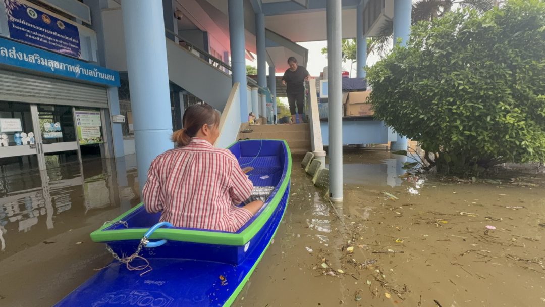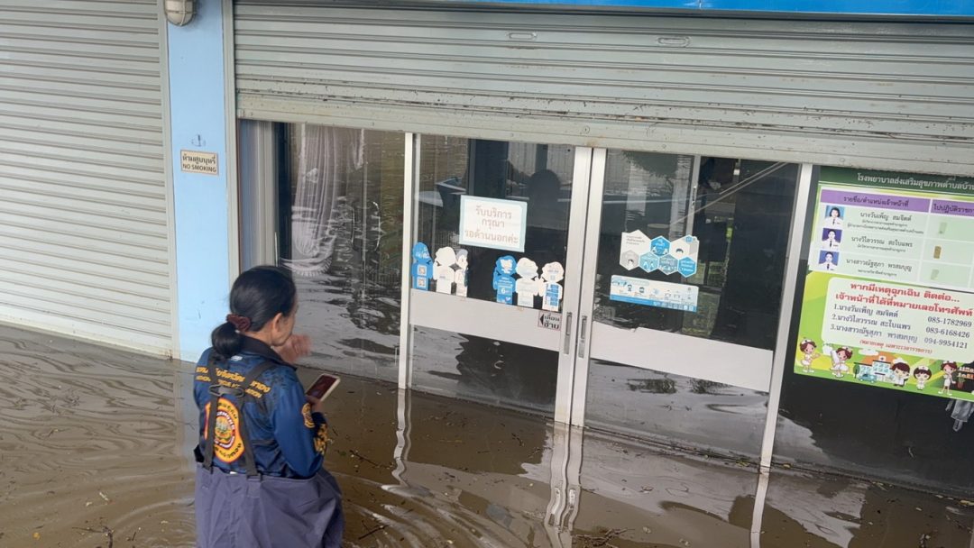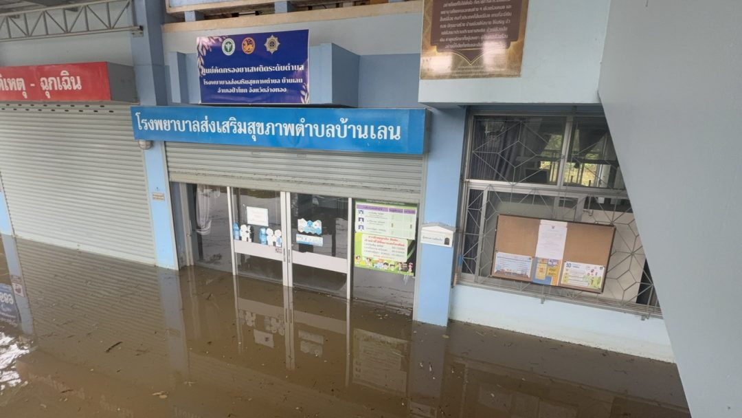 ที่โรงพยาบาลส่งเสริมสุขภาพตำบลบ้านเลน ตำบลโผงเผง อำเภอป่าโมก จังหวัดอ่างทอง ซึ่งน้ำยังคงท่วมสูงกว่า 1 เมตร หลังน้ำในคลองโผงเผง สาขาแม่น้ำเจ้าพระยา ได้พังทลายคันน้ำเข้าท่วมพื้นที่หมู่บ้าน และโรงพบาบาลส่งเสริมสุขภาพตำบล เมื่อวันที่ 7 พ.ย. ที่ผ่านมา ด้าน นาง วิไลวรรณ สะใบแพร ผู้อำนวยการ เล่าให้ฟังว่า เบื้องต้นทางเจ้าหน้าที่ได้ช่วยขนย้ายเครื่องมือแพทย์ สิ่งของอุปกรณ์สำคัญไว้บนชั้น 2 และยังคงให้การบริการชาวบ้านผู้ป่วยได้ตามปกติ ส่วนตู้โต๊ะสิ่งของที่มีน้ำหนักมากยังคงจมน้ำเป็นบางส่วน
