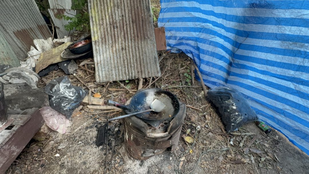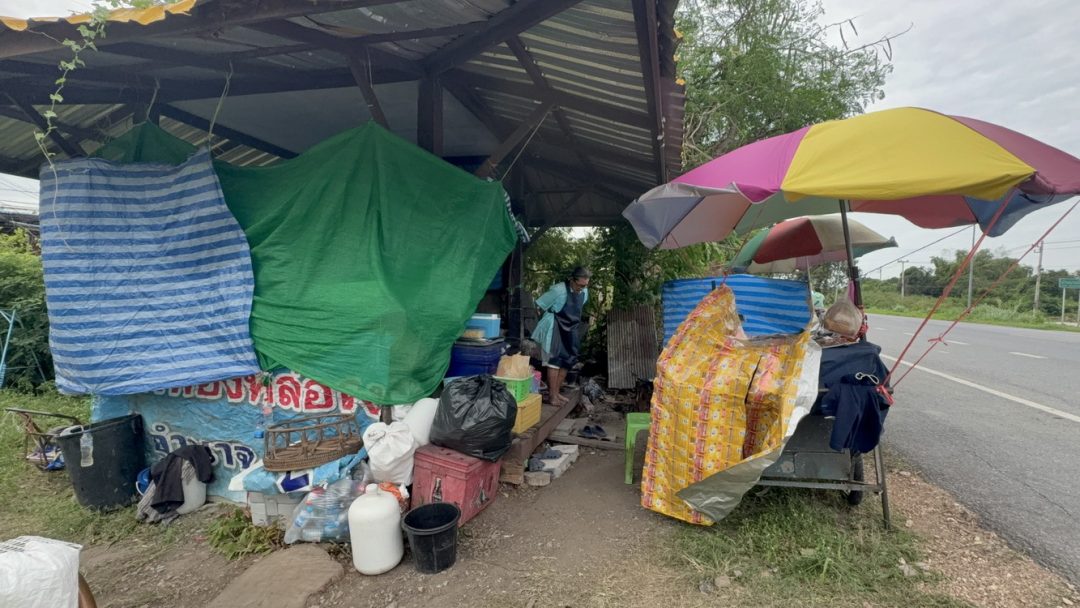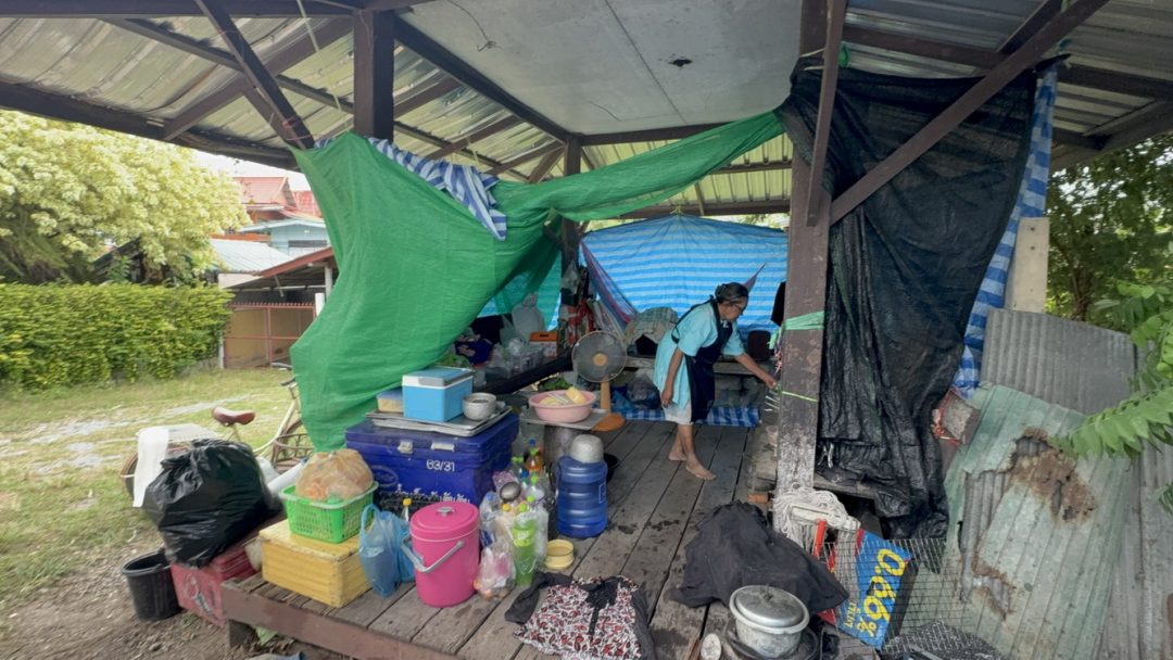 ส่วนบ้านตนเองนั้นอยู่ริมเขื่อนน้ำรั่วซึม เข้ามาภายในบ้านสูงประมาณ 20 – 30 เซนติเมตร เข้าห้องน้ำในบ้านและอยู่อาศัยไม่ได้ บางครั้งก็เดินเข้าไปไม่ทัน ทำให้ถ่ายเลอะเทอะกางเกง ต้องล้างและอาบน้ำใหม่ บางครั้งก็เดินลื่นล้มเปรอะเปื้อนเสื้อผ้า ก็ต้องล้างตัวอาบน้ำใหม่อีกรอบ เวลากลางคืนก็ต้องใช้ไฟฉายเดิน ส่วนการฉี่นั้นมีกระป๋องไม่ลำบาก เวลานอนก็ผวารถยนต์ที่วิ่งอยู่ริมถนนหวั่นอันตราย ทางด้านอาหารการกินนั้นมีเจ้าหน้าที่เอาข้าวของมาให้ บางครั้งเป็นไข่ไก่ ก็ยังได้ต้มและใส่บาตรในตอนเช้าอีกด้วย และก็ช่วยน้องสาวขายลูกชิ้นที่ริมถนนสร้างรายได้ต่อไป