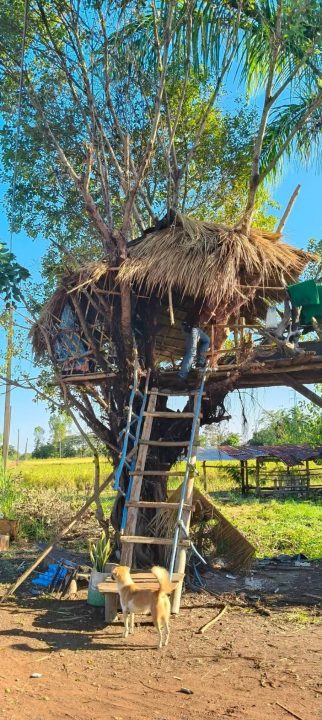 เพจสกลนครทันข่าว ได้โพสต์บ้านต้นไม้จนมีผู้ติดตาม หว่า 6 แสนคน เจ้าของเพจคือคุณสุรพล นนทะศรี ได้พาไปที่บ้านของนายไพรวัลย์ บุญมี อายุ 53 ปี และ น.ส.เจนจิรา ทุมมา 44 ปี บ้านเลขที่ 441 ม.3 ต.ฮางโฮง อ.เมือง จ.สกลนคร ซึ่งตั้งอยู่กลางทุ่งนาบรรยากาศโล่งมีต้นไม้น้อย ที่หน้าบ้านมีบ้านลักษณะเป็นกระต๊อบอยู่บนต้นไทรย้อยและต้นปาล์ม สูงจากพื้นดินประมาณ 3 เมตร ด้านบนหลังคามุงจาก พื้นปูด้วยไม้ไผ่มีแผ่นยางปูทับอีกชั้นหนึ่ง ข้างบนมีพัดลม ดบาะนั่งพักผ่อน และมีเครื่องเสียงพร้อมตู้ลำโพงไว้ขับกล่อม
