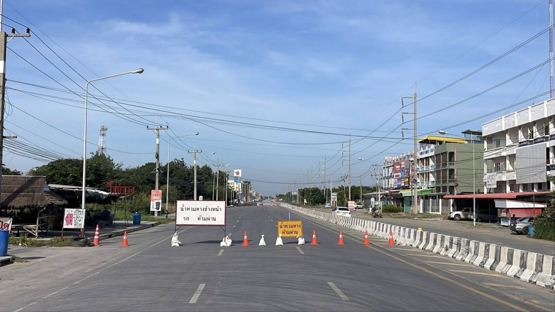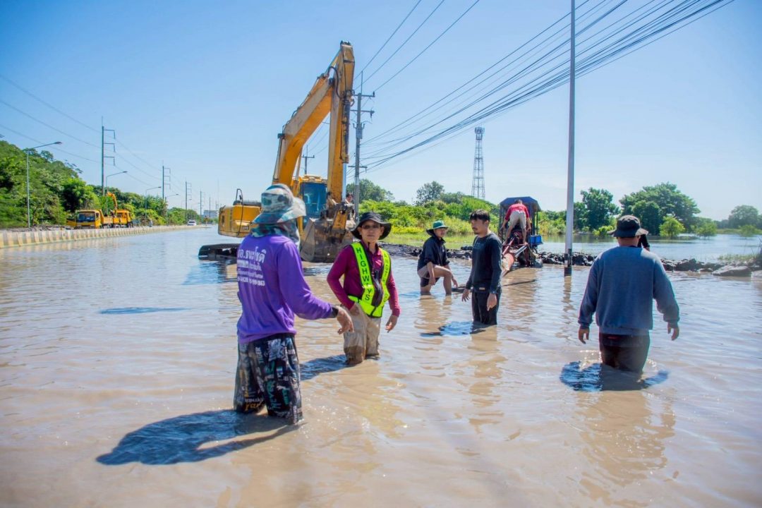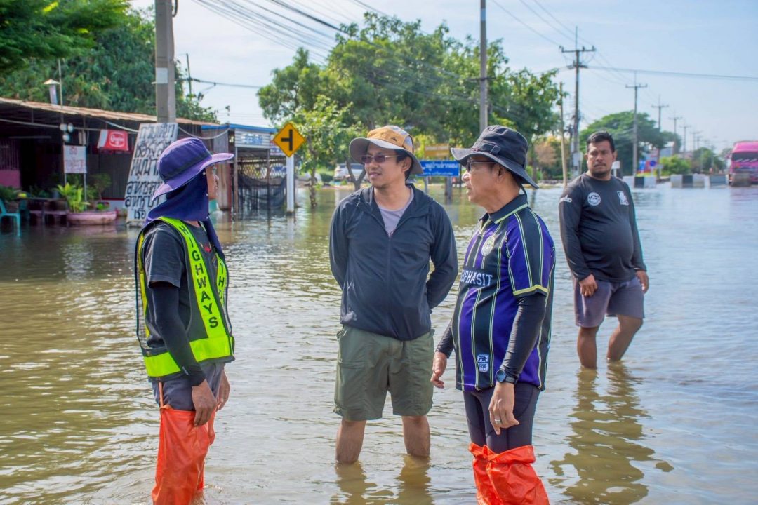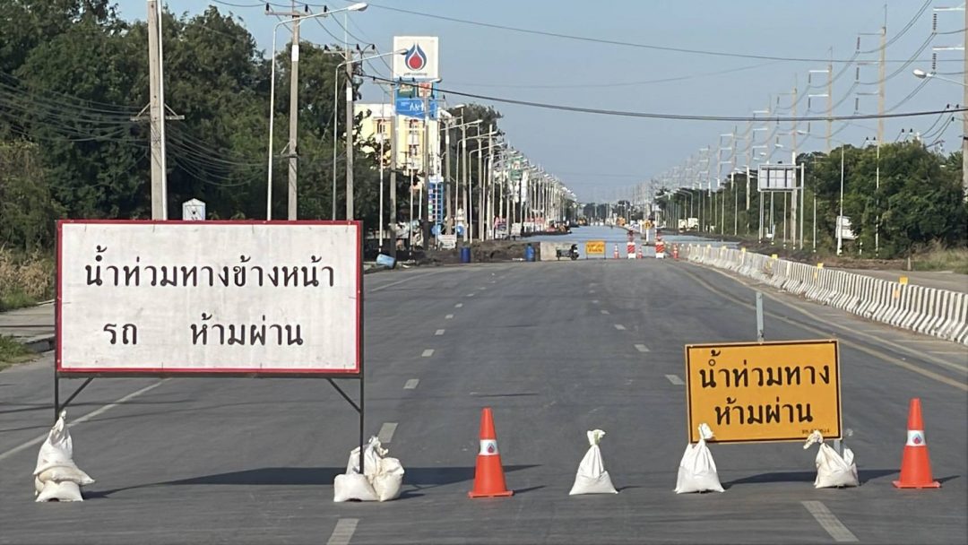 ขณะที่ทางหลวงหมายเลข 33 สายป่าโมก – สุพรรณบุรี ช่วงหน้าหมู่บ้านทำกลอง ตำบลเอกราช อำเภอป่าโมก ยังมีน้ำท่วมขังอยู่ประมาณ 40 – 50 เซนติเมตร แขวงทางหลวงอ่างทองปิดการจราจร (ชั่วคราว) ไม่อนุญาตให้รถทุกชนิดผ่านเส้นทาง เพราะมีเครื่องจักรกำลังดำเนินการทำคันล้อมและสูบน้ำออกจากผิวจราจร สำหรับการสูบน้ำออกจากผิวจราจร จะใช้การสูบน้ำเป็น 3 ระยะ คือ สูบน้ำจากผิวการจราจร ตำบลเอกราช ออกคลองระบายของกรมชลประทาน เข้าพื้นที่เขตเทศบาลตำบลป่าโมก และจะสูบออกที่ปลายคลองระบายออกแม่น้ำเจ้าพระยา ใช้เครื่องสูบน้ำจากกรมชลประทาน 4 เครื่อง ปภ.เขต 16 จำนวน 1 เครื่อง และของเทศบาลตำบลป่าโมก 4 เครื่อง