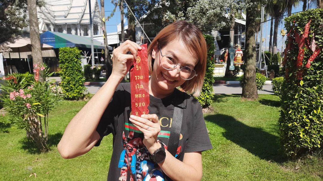 ทางด้านนางสาวกรญาณิน เอี่ยมมี เดินทางมาจากย่านร่มเกล้า นำประทัด 1,000 นัดพร้อมด้วยเครื่องเซ่นไหว้มาแก้บนท้าวเวสสุวรรณหลังได้โชคก้อนโตในงวดที่ผ่านมานางสาวกรญาณินกล่าวว่าตนเองมาขอพรจากท้าวเสสุวรรณเป็นประจำตั้งแต่ตนเองมาขอพรกับท้าวเวสสุวรรณตั้งแต่ครั้งแรกจนถึงวันนี้ก็ปีกว่าแล้วถือว่าโชคดีได้โชคมาตลอดทั้งปีจะได้มากน้อยบ้างต่างกันไปแลัก็มียางครั้งเหมือนกับท้าวเวสสุวรรณมาเข้าฝันว่าให้ซื้อเลขตัวนี้ก็เคยมีอยู่บ่อยครั้งแม้ตอนท่านเข้าฝันจะเห็นไม่ชัดว่าเป็นท่านท้าวเวสฯแต่ตนเองนั้นรู้สึกได้ว่าเป็นท่าน ซึ่งท้าวเวสเหมือนจะบอกว่าเลขที่ได้ตอนแก้บนนั้นไม่ใช่จึงมาเข้าฝันบอกให้ใหม่อะไรอย่างนั้น วันนี้จึงมีโอกาศมาแก้บนท้าวเวสสุวรรณอีกครั้งและก่อนกลับได้จุดประทัดได้เลข 520 22 นำกลับไปอีกครั้ง
