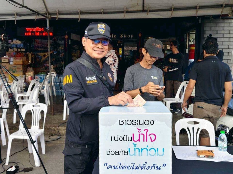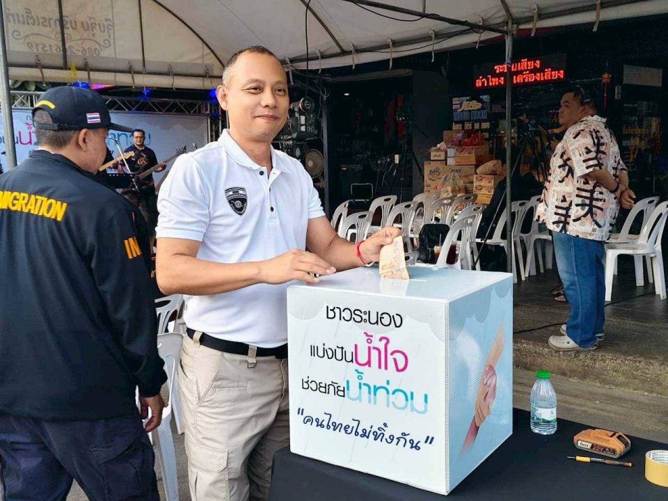 พ.ต.อ.เด่นชาย เจริญยุทธ ผกก.ตม.จว.ระนอง พร้อมด้วย พ.ต.ท.พิษณุ เบี้ยแก้ว รอง ผกก.ตม.จว.ระนอง และข้าราชการตำรวจในสังกัด ร่วมกิจกรรมชาวระนองแบ่งปันน้ำใจช่วยภัยน้ำท่วม “คนไทยไม่ทิ้งกัน”
