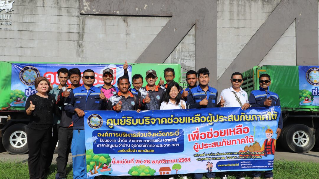 ที่ อบจ.กระบี่ นายสมศักดิ์ กิตติธรกุล นายกองค์การบริหารส่วนจังหวัดกระบี่ให้กำลังใจเจ้าหน้าที่กองป้องกันและบรรเทาสาธารณภัย ในการปล่อยแถวขบวนรถลำเลียงสิ่งของบริจาคเพื่อนำไปช่วยเหลือพี่น้องผู้ประสบภัยน้ำท่วม จำนวน 3 คันรถพ่วง (จังหวัดพัทลุง 1 คัน จังหวัดสตูล 1 คัน และจังหวัดตรัง 1 คัน) ซึ่งทาง อบจ. ได้เปิดศูนย์ช่วยเหลือผู้ประสบอุทกภัยภาคใต้ ระหว่างวันที่ 25-28 พฤศจิกายน 2568 มีประชาชนชาวจังหวัดกระบี่ได้ร่วมกันบริจาคทั้งน้ำดื่ม ข้าวสาร อาหารแห้ง ข้าวของเครื่องใช้ที่จำเป็น รวมถึงยาสามัญประจำบ้าน