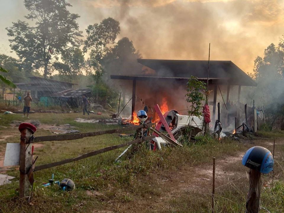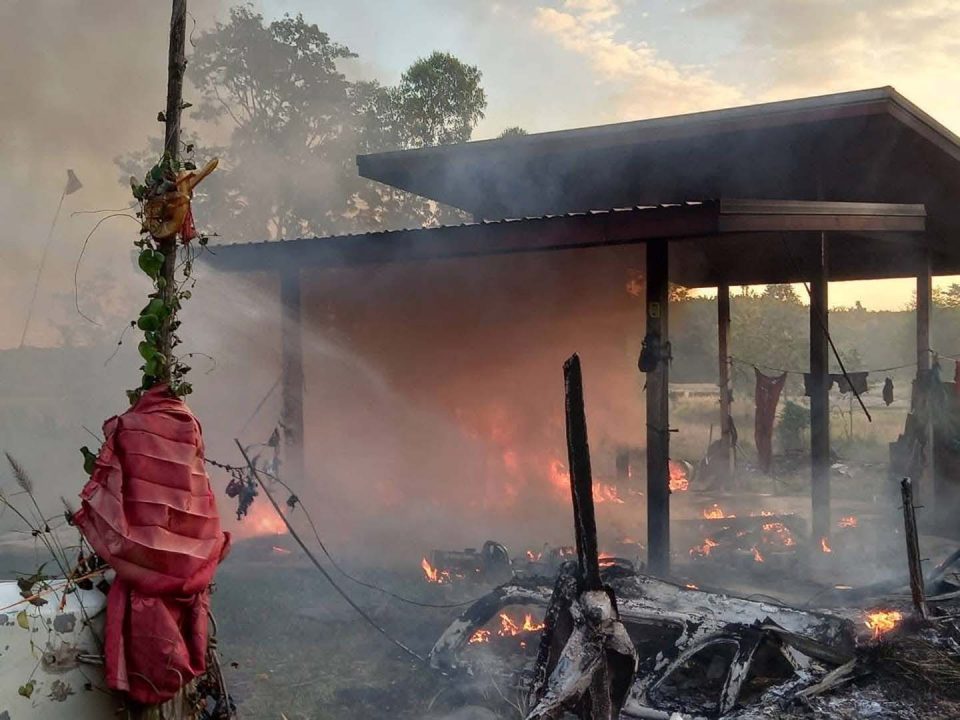 ภายใต้การอำนวยการของนายทินกร พลเยี่ยม รักษาราชการแทนนายอำเภอนิคมคำสร้อยฝ่ายความมั่นคงอำเภอนิคมคำสร้อย ได้รับแจ้งจาก ผู้ใหญ่บ้านคำกั้ง ตำบลนิคมคำสร้อย อำเภอเมือง จังหวัดมุกดาหาร ว่ามีชายคลุ้มคลั่ง เผาบ้านตัวเอง จึงได้ลงพื้นที่ร่วมกับฝ่ายความมั่นคง กองร้อย อส. อำเภอนิคมคำสร้อย ที่ 7 พร้อมด้วยเจ้าหน้าที่ตำรวจ สภ. นิคมคำสร้อย เจ้าหน้าที่ดับเพลิง อบต.นิคมคำสร้อย และเจ้าหน้าที่ดับเพลิง ทต.นิคมคำสร้อย ลงที่เกิดเหตุที่ได้รับแจ้งดังกล่าว ที่เกิดเหตุพบเป็นบ้านชั้นเดียว ถูกเพลิงไหม้ทั้งหลัง เบื้องต้นระงับเพลิงไว้ได้ จากการสำรวจเบื้องต้น เสียหายทั้งหลัง มีนายสิทธิเดช ผู้ก่อเหตุ อายุ 34 ปี