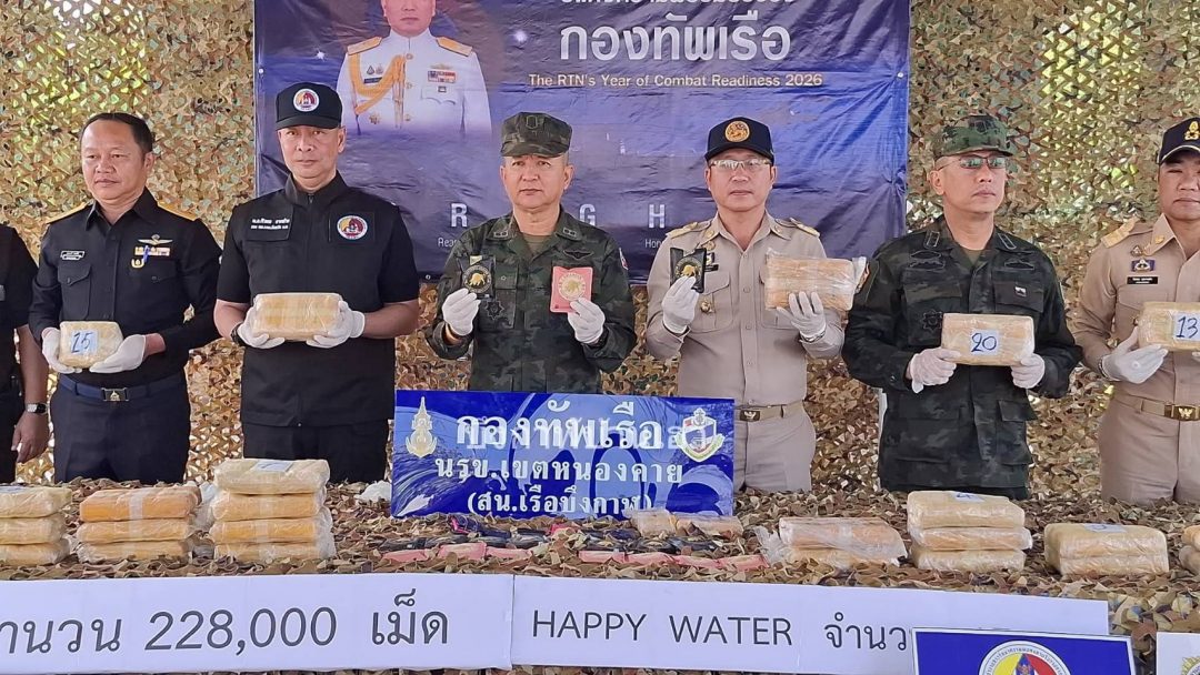 สถานีเรือบึงกาฬ หน่วยเรือรักษาความสงบเรียบร้อยตามลำแม่น้ำโขง เขตหนองคาย ร่วมกับ กองกำลังสุรศักดิ์มนตรี โดยส่วนสกัดกั้น ภาคตะวันออกเฉียงเหนือ/เหนือ ตอนบน นบ.ยส.24 บก.ควบคุมที่ 2 ตรวจพบกระสอบต้องสงสัยถูกทิ้งไว้บริเวณริมฝั่งแม่น้ำโขง บ้านบังบาตร ตำบลชัยพร อำเภอเมืองบึงกาฬ จังหวัดบึงกาฬ ผลการตรวจสอบพบของกลางเป็นยาเสพติดให้โทษประเภท ยาบ้า จำนวน 228,000 เม็ด และยาเสพติดชนิดใหม่ HAPPY WATER จำนวน 15 ซอง
