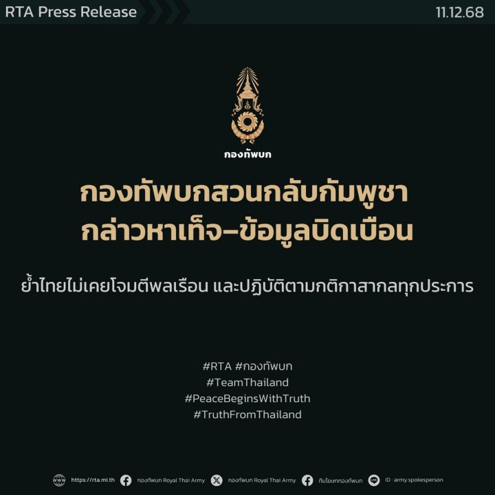 พลตรี วินธัย สุวารี โฆษกกองทัพบก กล่าวว่าจากถ้อยแถลงของพลโท มาลี โสเจียตา โฆษกกระทรวงกลาโหมกัมพูชา เมื่อ 11 ธ.ค.68 เป็นการกล่าวที่บิดเบือนไปจากข้อเท็จจริงทุกประเด็น ดังนี้