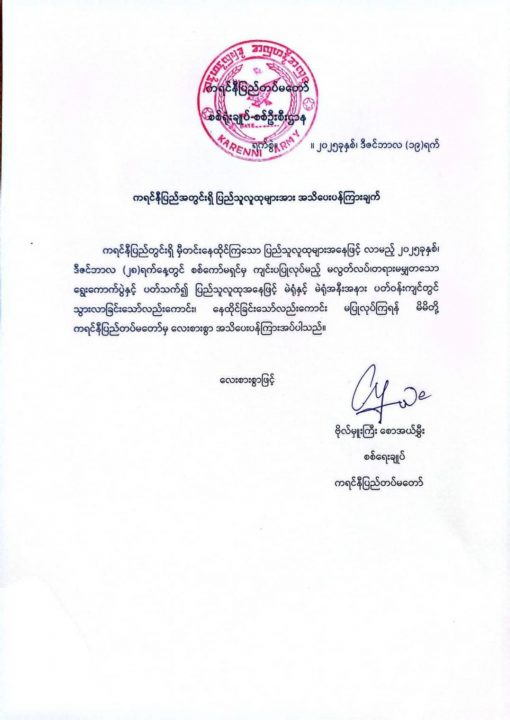 แหล่งข่าวผู้นำระดับสูง กองทัพกะเหรี่ยงคาเรนนี เปิดเผยว่า เมื่อวันที่ 18 ธันวาคม 2568 ที่ผ่านมา กองทัพกะเหรี่ยงคาเรนนี โดย พันเอก แอ มุย เสนาธิการกองทัพกะเหรี่ยงคาเรนนี ได้ลงนามในหนังสือประกาศเตือนให้ประชาชนชาวคาเรนนี ห้ามเข้าใกล้หน่วยเลือกตั้ง ที่ทางการเมียนมาจัดหน่วยเลือกตั้งขึ้นมาในรัฐคาเรนนี ได้แก่ เมืองลอยก่อว์ เมืองดีมอโซว์