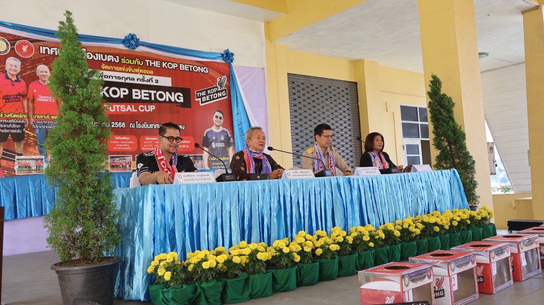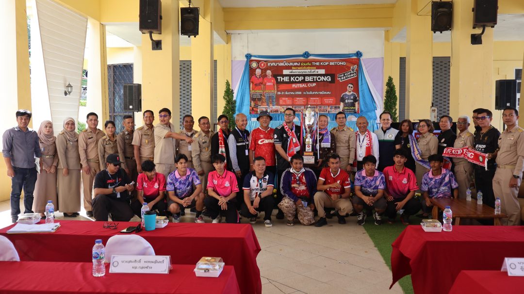 ที่ศาลาภิรมย์ทัศน์เทศบาลเมืองเบตง อ.เบตง จ.ยะลา นายใช้ วงศ์นิตยลัภย์ นายกเทศมนตรีเมืองเบตง นายวรากร ยานุทัย ปลัดเทศบาลเมืองเบตง นางศิริกานต์ จันทร์รัตน์ ผอ.กองการศึกษาเทศบาลเมืองเบตง และนายรีฮาน มามุติพงศ์ ประธาน The Kop Betong ร่วมแถลงข่าวการจัดการแข่งขันกีฬาฟุตซอลต้านภัยยาเสพติด THE KOP BETONG FUTSAL CUP เพื่อการกุศล ครั้งที่ 2 ระหว่างวันที่ 29 – 31 ธันวาคม 2568 พร้อมประชุมชี้แจงระเบียบกติกาและการจับฉลากแบ่งสายการแข่งขันของทีมเข้าร่วมทั้ง 32 ทีม โดยมีนายบรรเจิด พรหมพิทักษ์ ที่ปรึกษากิตติมศักดิ์ กลุ่ม THE KOP BETONG หัวหน้าส่วนราชการ เจ้าหน้าที่กองการศึกษางานกิจกรรมเด็กและเยาวชน ตัวแทนผู้จัดการทีม นักกีฬา สมาชิก THE KOP BETONG ช่างภาพ สื่อมวลชน เข้าร่วมงานอย่างคับคั่ง