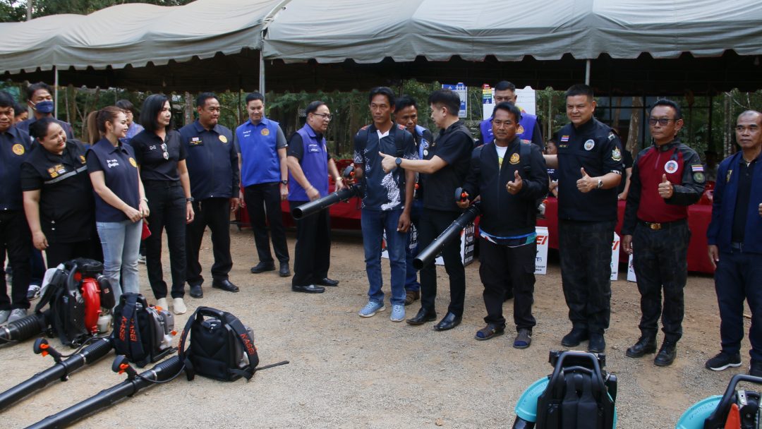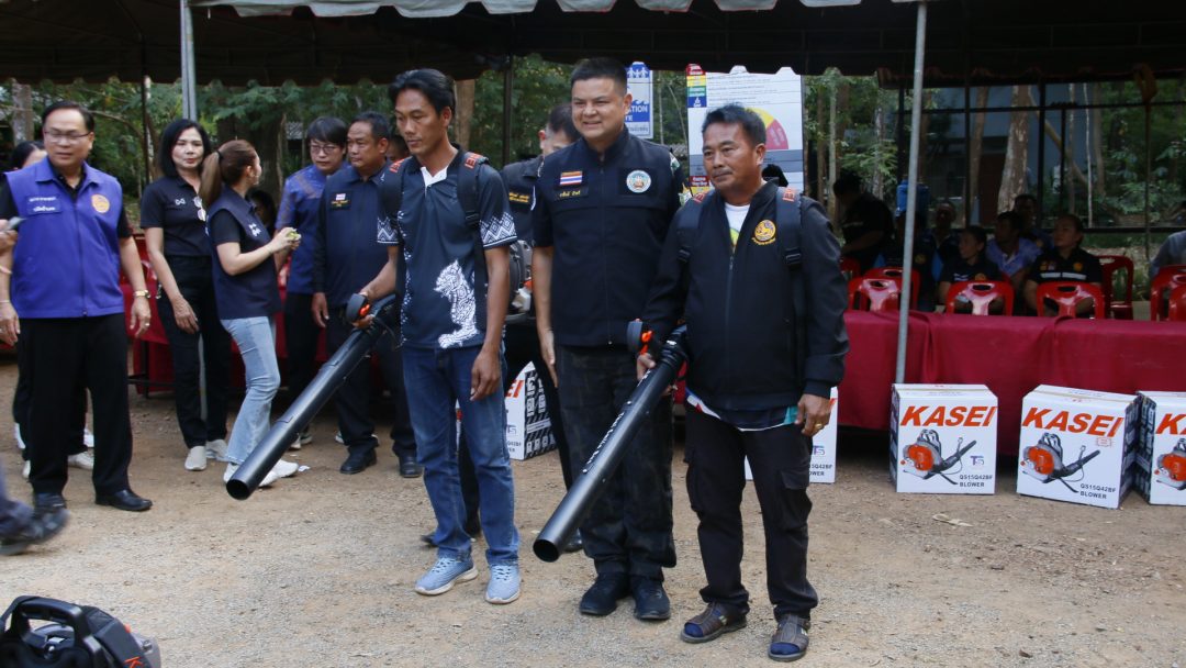ในการนี้นายวุฒิพงษ์ สุภัควนิช รองผู้ว่าราชการจังหวัดกาญจนบุรี ได้มอบเครื่องเป่าลมให้กับเครือข่ายชุมชนเสี่ยงไฟป่า ต.ช่องสะเดา อ.เมืองกาญจนบุรี จำนวน 12 เครื่อง พื้นที่เสี่ยงไฟป่าอำเภอศรีสวัสดิ์ จำนวน 15 เครื่อง และพื้นที่เสี่ยงไฟป่า อำเภอบ่อพลอย จำนวน 6 เครื่อง รวม 33 เครื่อง ซึ่งก่อนหน้านี้ได้มีการประชุมเชิงปฏิบัติการเสริมศักยภาพการควบคุมไฟป้าด้วยเครื่องเปาลม และฝึกปฐมพยาบาบาลเบื้องต้น เพื่อสร้างความรู้ความเข้าใจเกี่ยวกับวิธีการใช้งานและการดูแลรักษาเครื่องเป่าลมอย่างถูกต้องและปลอดภัย รวมถึงเสริมสร้างทักษะการปฐมพยาบาลเบื้องต้นให้แก่ผู้ปฏิบัติงานเพื่อเตรียมความพร้อมในการรับมือกับสถานการณ์ฉุกเฉินที่อาจจะเกิดขึ้นโดยไม่คาดคิด และส่งเสริมให้มีส่วนร่วมของภาคประชาชนในการป้องกันและแก้ไขปัญหาไฟป่าและหมอกควันอย่างยั่งยืน…..นายวุฒิพงษ์ กล่าวก่อนมอบเครื่องเป่าลม