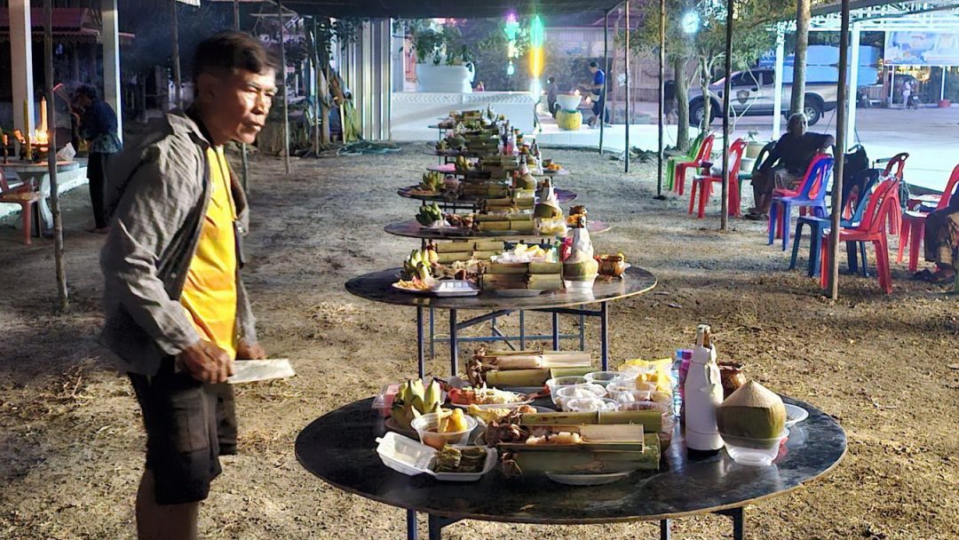 ซึ่งทาง นาย บุญล้อม อินทรศิริ วัย 74 ปี ชาวบ้าน เล่าให้ฟังว่า ชาวบ้านมีความเชื่อว่าคนที่ไม่เคยทำบุญทำกุศลเมื่อตายไปแล้ว หากไม่มีใครทำบุญให้ก็จะอดยากไม่มีกิน ทางพระครูสุตานุยุต เจ้าอาวาสวัดบ้านแก จึงร่วมกับชาวบ้านทำโต๊ะจีนผีเลี้ยผีที่ไม่มีญาติ และไม่เคยทำบุญกุศล ได้มีกินร่วมกันในช่วงส่งท้ายปีเก่าต้อนรับปีใหม่ ร่วมกับญาติเหล่าดวงวิญญาณที่ล่วงลับไปแล้ว และครั้งนี้ไม่พลาดส่องเลขธูปที่จุดเสี่ยงทาย ได้ตัวเลขตัวเลข 454 นำไปเสี่ยงดวง