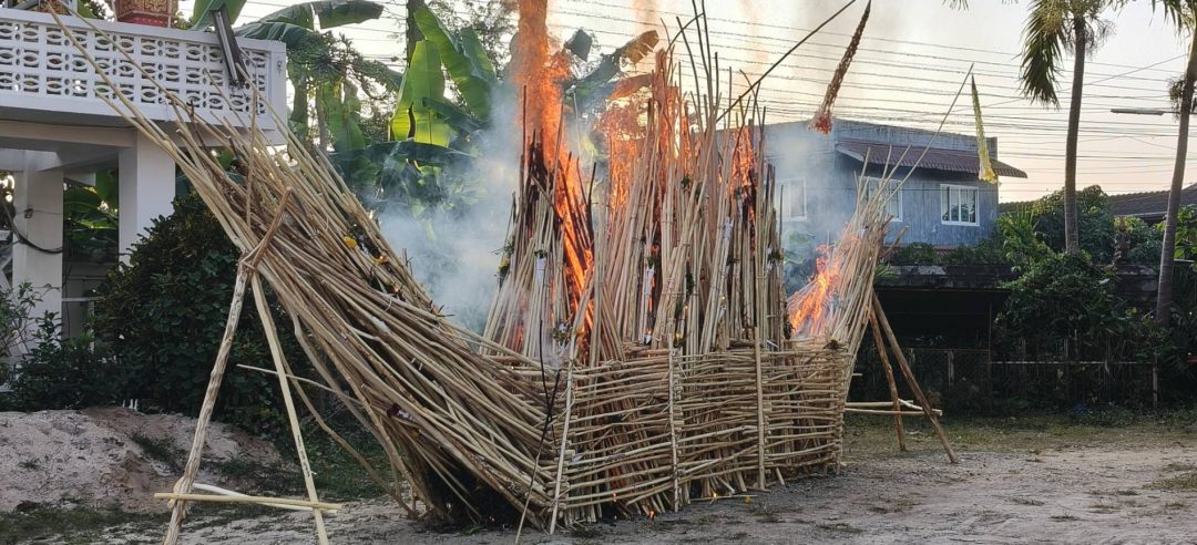 ขณะเดียวกัน ด้วยความเชื่อว่าในช่วงเดือน 4 เหนือ (ธันวาคม–มกราคม) อากาศหนาวเย็นจัด พระพุทธเจ้าหรือพระพุทธรูปภายในวิหารก็ทรงรับรู้ถึงความหนาวเช่นเดียวกับมนุษย์ ชาวบ้านจึงร่วมกันนำ หลัวซึ่งจะรวบรวมไม้ที่เป็นสิริมงคลนำมาเอาเปลือกไม้ออก และนำมารวมกันที่วัดสร้างเป็นเรือสำเภาเมื่อถึงเวลาก็จะทำพิธีก่อนจุดไฟถวายเป็นพุทธบูชา เพื่อให้ความอบอุ่นแก่พระพุทธปฏิมา