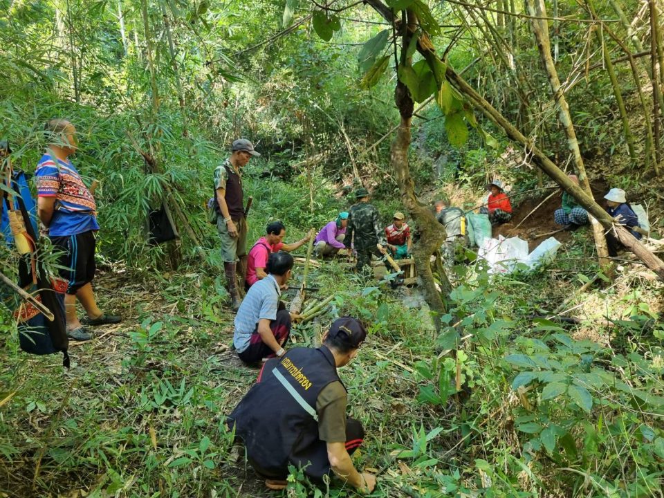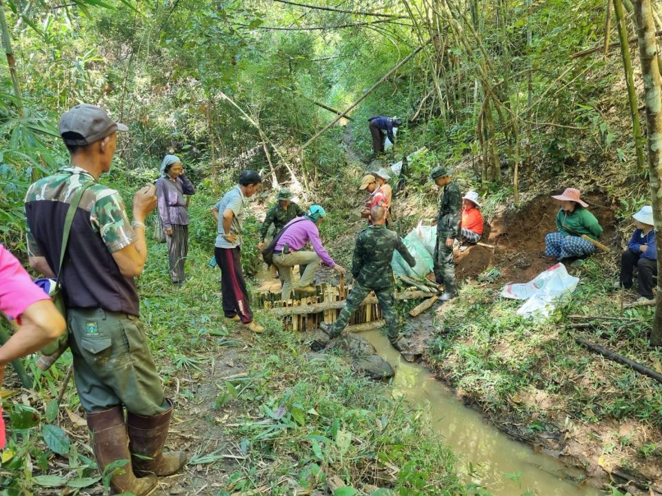 ร่วมกับราษฎรบ้านอาโจ้ดำเนินการสร้างฝายจำนวน 1 ฝาย ขนาดกว้าง 0.8 เมตร ยาว 2 เมตร สูง 0.9 เมตร เพื่อชะลอการไหลของน้ำ เก็บกักตะกอนธรรมชาติที่ไหลมากับน้ำ เป็นแหล่งน้ำให้กับสัตว์ป่าในห้วงฤดูแล้งและยังสร้างความชุ่มชื้นให้กับป่า โดยใช้วัสดุกระสอบทราย ไม้ไผ่ ก้อนหินที่เป็นวัสดุธรรมชาติในพื้นที่