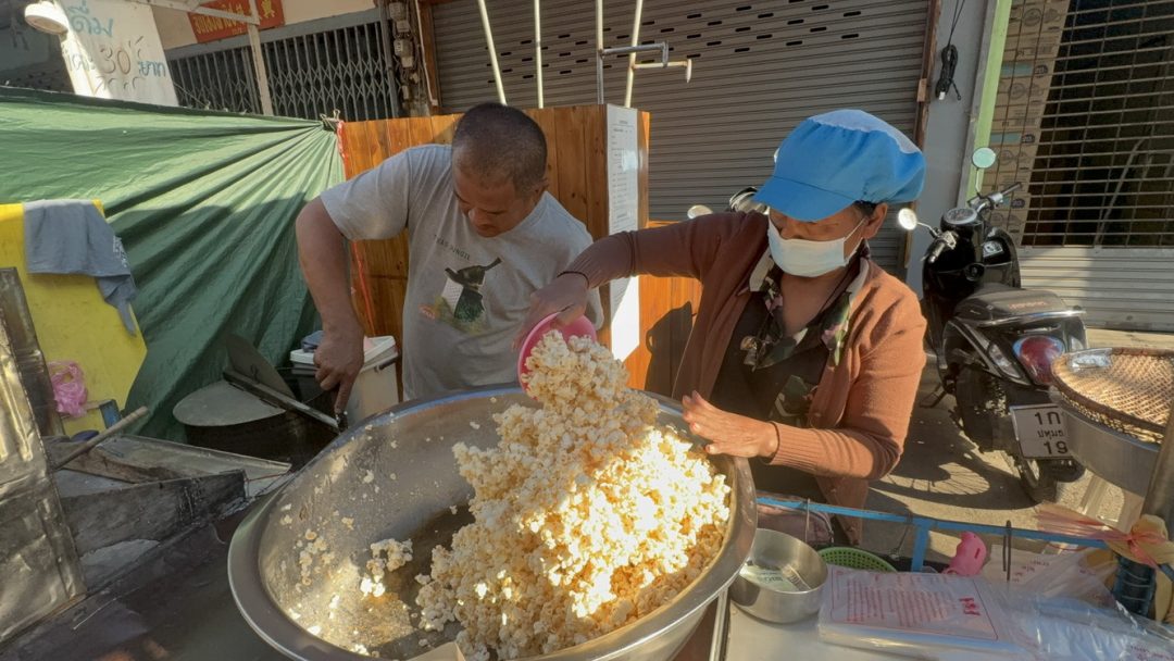 ซึ่งจะควบคุมไฟให้อยู่ในความร้อนที่พอดี ซึ่งการคั่วจากเตาถ่าน จะเพิ่มความหอมจากควันไม้เตาถ่าน จะแทรกเข้าไปในเนื้อข้าวโพดที่กำลังพองตัว ยิ่งเพิ่มความหอมในทุกคำที่ได้ทาน แล้วนำไปใส่ตะแกรงไม้ไผ่ ร่อนข้าวโพดที่เม็ดเล็กและไม่แตก แยกลงลงไว้ในกะละมัง ส่วนข้าวโพดที่แตกสวยงามก็ใส่กะละมังสแตนเลส แล้วคลุกเค้ากับน้ำราดสูตรเด็ดของทางร้าน โดยนำไปไปคลุกบนเตาถ่านอีกครั้งก่อนนำใส่ถุงขาย