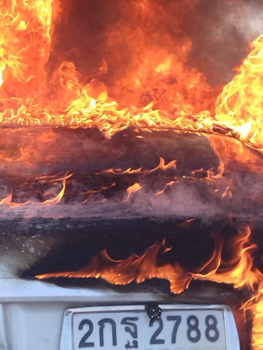 รถคันนี้ซื้อมาประมาณ 10 ปี ผ่อนหมดแล้วรู้สึกตกใจมากทำอะไรไม่ถูกไม่รู้ว่าเกิดจากสาเหตุอะไรก่อนไฟไหม้ได้กลิ่นน้ำมัน โชยมาโชคดีตอนเกิดเหตุ มีคนใส่ชุดทหารขับรถผ่านมาพอดีมาช่วยดับรถและเรียกรถดับเพลิงรถคันซื้อมาประมาณ 400,000 บาท ที่เสียดายคือพระที่อยู่ในรถแต่ก็ไม่ได้เป็นพระที่มีราคามันมีคุณค่าทางจิตใจเพราะใช้รถคันนี้มานาน