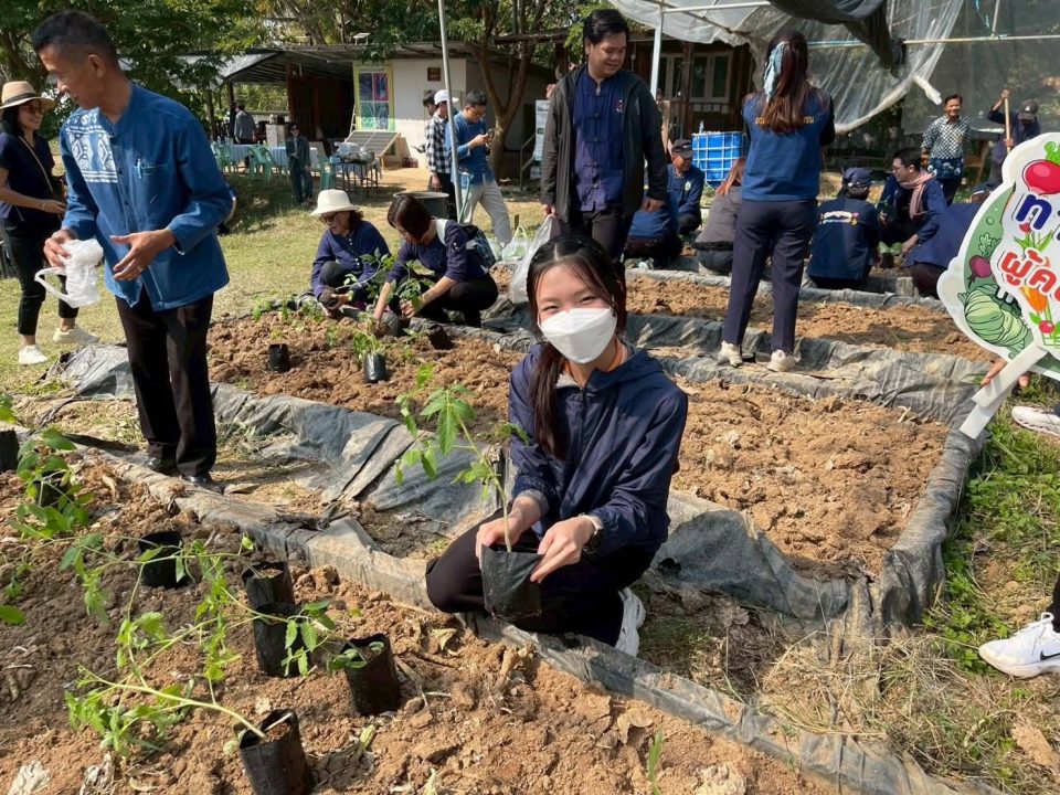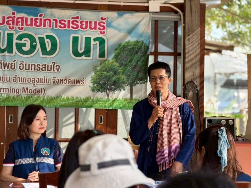 ที่ศูนย์เรียนรู้การพัฒนาคุณภาพชีวิตตามหลักทฤษฎีใหม่ แปลงของนางสาวจุฑาทิพย์ อินทรสมใจ หมู่ที่ 2 ตำบลสูงเม่น อำเภอสูงเม่น จังหวัดแพร่ สำนักงานพัฒนาชุมชนจังหวัดแพร่ ร่วมกับเครือข่ายโคก หนอง นา พัฒนาชุมชนจังหวัดแพร่ ประชุมเชิงปฏิบัติการสนับสนุนการขับเคลื่อนศูนย์เรียนรู้การพัฒนาคุณภาพชีวิตตามหลักทฤษฎีใหม่ ประยุกต์สู่ “โคก หนอง นา” ระดับจังหวัด