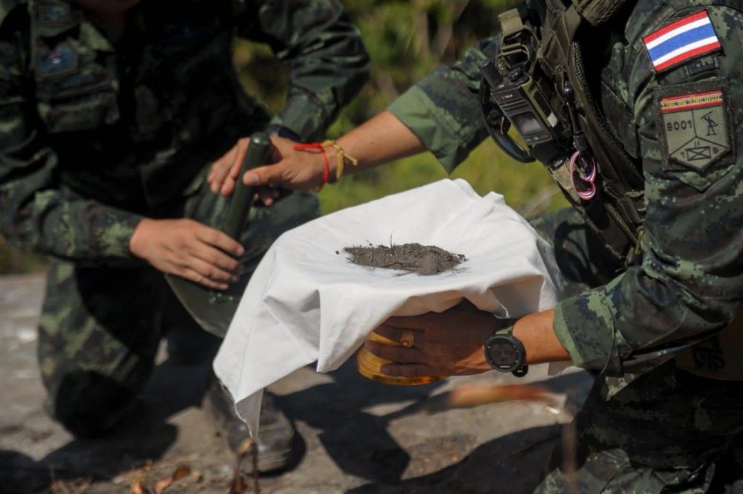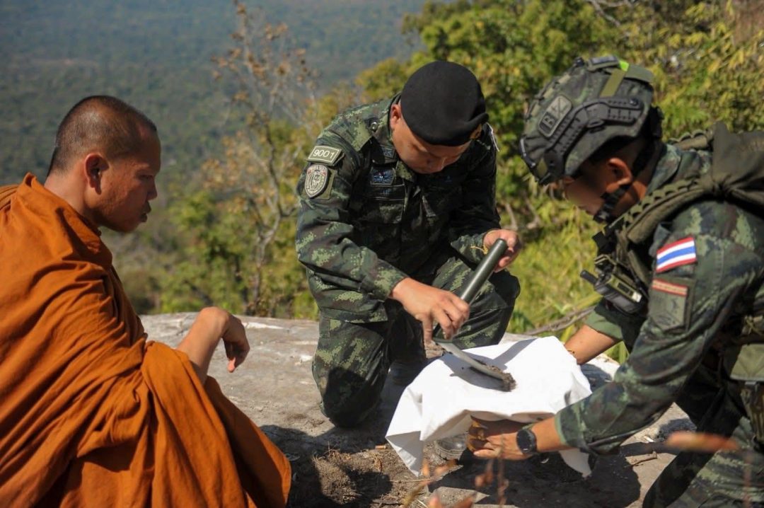 พ.ท. วิศรุต วงศ์ศิริรัตน์ ผบ.พัน.ร.91 พล ร.9 จ.กาญจนบุรี ปฎิบัติหน้าที่แนวหน้าพื้นที่เนิน 677 ช่องอานม้า จ.อุบลราชธานี ตัวแทนกำลังพล นิมนต์พระภิกษุสงฆ์เพื่อมาทำพิธีทางศาสนา กระทำพิธีเก็บดินสมรภูมิพิทักษ์ราชอาณาจักรไทย พ.ศ. 2568 พื้นที่เนิน 677 ช่องอานม้า จ.อุบลราชธานี บริเวณที่กำลังพลเสียชีวิตจากเหตุปะทะชายแดนไทย-กัมพูชา