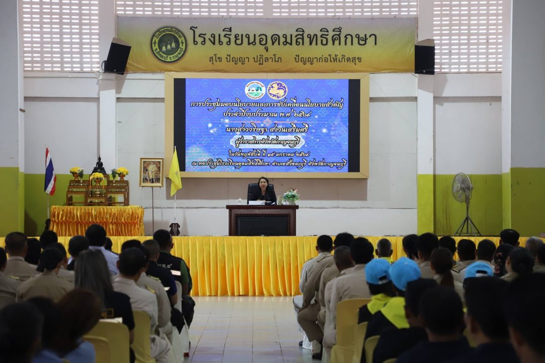 ที่หอประชุมโรงเรียนอุดมสิทธิศึกษา อำเภอสังขละบุรี จังหวัดกาญจนบุรี นางสาววริษฐา สงวนเสริมศรี ผู้ว่าราชการจังหวัดกาญจนบุรี ลงพื้นที่มอบแนวทางการปฏิบัติราชการแก่ หัวหน้าส่วนราชการระดับอำเภอ ผู้บริหารท้องถิ่น กำนัน ผู้ใหญ่บ้าน ในพื้นที่อำเภอสังขละบุรี พร้อมด้วย นาย วุฒิพงษ์ สุภัควนิช รองผู้ว่าราชการจังหวัดกาญจนบุรี นางสาวกมลชญา ประเสริฐสิน ปลัดจังหวัดกาญจนบุรี โดยมี นายสุริยศักดิ์ เหมือนอ่วม นายอำเภอสังขละบุรี หน้าส่วนราชการระดับอำเภอ ผู้บริหารท้องถิ่น กำนัน ผู้ใหญ่บ้าน ผู้นำชุมชนในอำเภอสังขละบุรี ร่วมรับมอบนโยบายฯ