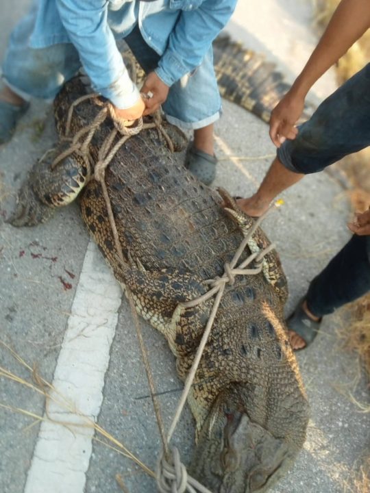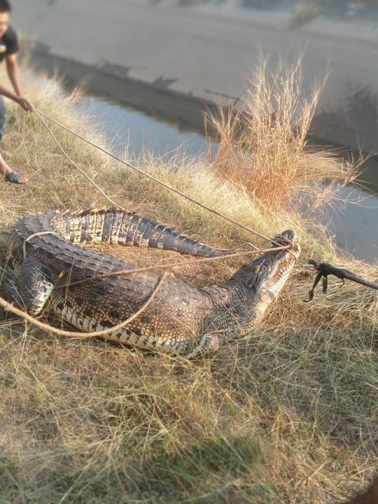 @chaijexu นครปฐม ชาวบ้านออกไปหาปลาถึงกับผงะเจอจระเข้ บิ๊กไซด์ โผล่ในคลองชลประทาน ผู้สื่อข่าวรายงานว่า ชาวบ้านออกมาหาปลา พบจระเข้ ขนาดใหญ่ อยู่บริเวณคลองส่งน้ำ หมู่ที่ 8 ต.ทุ่งบัว อ.กำแพงแสน จ.นครปฐม เป็นจระเข้น้ำจืดขนาดใหญ่ ชาวบ้านที่ขี่รถผ่านไปมาเห็นจึงจอดรถดูและช่วยกันจับจระเข้ขึ้นมาบนฝั่ง จากการสอบถาม นายต้นชาวบ้าน ที่ไปหาปลาและเห็นจระเข้เป็นคนแรกเล่าว่า ตนได้ขี่มอเตอร์ไซค์เลาะคลองมาเรื่อยๆจนกระทั่งเห็นทำเลดีคาดมีปลาเยอะ เลยจอดรถลงไปสำรวจในคลองเห็นผิดสังเกต ในน้ำมีคล้ายๆท่อนไม้สีดำจึงลงไปดูใกล้ๆถึงกับผงะ เห็นเป็นจระเข้ตัวใหญ่ จากนั้นก็มีชาวบ้านผ่านมาผ่านไปได้จอดอยู่และช่วยกันลงไปจับจระเข้ขึ้นมาโดย ใช้เชือกเป็นอุปกรณ์ในการจับจระเข้ ใช้เวลาไม่นานก็สามารถนำจระเข้ขึ้นมาบนฝั่งได้สำเร็จ จระเข้มีขนาดใหญ่ความยาวประมาณ 2 เมตร น้ำหนักกว่า100 กิโลกรัม คาดว่าจระเข้ตัวนี้น่าจะหลุดออกมาจากฟาร์มบริเวณใกล้เคียงแถวนั้น คลองชลประทานเส้นนี้ติดอยู่กับอำเภอพนมทวน จังหวัดกาญจนบุรีไหลผ่านอำเภอกำแพงแสนจังหวัดนครปฐม จึงฝากเตือนชาวบ้านที่ลงไปหาปลาหรือลูกหลานที่ลงไปเล่นน้ำในคลองนี้ให้ระวังอาจจะไม่ใช่มีแค่ตัวเดียว จากนั้นได้ประสานเจ้าหน้าที่ที่เกี่ยวข้องให้ลงมาตรวจสอบเพื่อค้นหาว่ามีจระเข้อยู่อีกหรือไม่ ภาพ-ข่าว กิตติพงษ์ จันทร์ละมูล ผู้สื่อข่าว จ.นครปฐม