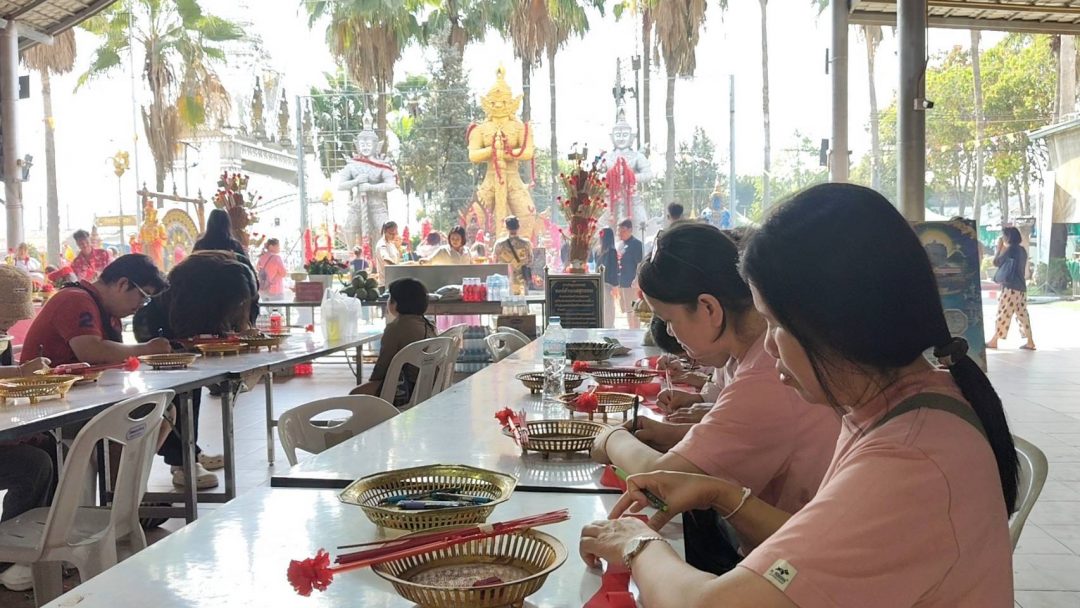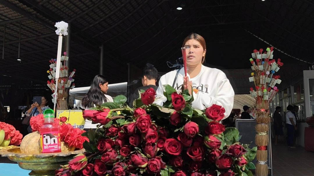 ทางด้านยายเพ็ญนำมะพร้าวน้ำหอมทลายใหญ่จำนวน 10 ลูก พร้อมเครื่องเซ่นไหว้ เดินทางมาแก้บนท้าวเวสสุวรรณ หลังเชื่อว่าได้รับความคุ้มครองจากเหตุการณ์ที่เกิดขึ้นเมื่อคืนที่ผ่านมา ยายเพ็ญเปิดเผยว่า เมื่อช่วงกลางดึกขณะขับรถกลับบ้านตามปกติ ได้พบด่านตรวจของเจ้าหน้าที่ตำรวจ แม้ตนจะไม่ได้ทำผิดกฎหมายใด ๆ แต่ก็รู้สึกกังวลเนื่องจากเป็นเวลากลางคืนจึงรู้สึกกลัวมากเป็นพิเศษ ตนจึงตั้งจิตอธิษฐานขอพรต่อท้าวเวสสุวรรณให้ช่วยคุ้มครอง โดยบนบานไว้ว่าหากผ่านด่านไปได้โดยไม่ถูกเรียกตรวจ จะนำมะพร้าว 10 ลูกมาถวายทันที เมื่อถึงด่านตรวจ ปรากฏว่าเจ้าหน้าที่ไม่ได้เรียกรถของตนตรวจแต่อย่างใด ทั้งที่รถคันอื่นถูกเรียกตามปกติ ทำให้ตนสามารถขับผ่านไปได้อย่างราบรื่น ตนเชื่อว่าเป็นเพราะบารมีของท้าวเวสสุวรรณที่ช่วยให้แคล้วคลาดปลอดภัย วันนี้ตนจึงเดินทางมาแก้บนตามที่บนบานเอาไว้ พร้อมกับจุดธูปเสี่ยงทาย ได้เลข 53 เพื่อนำกลับไปลุ้นโชคต่อไป