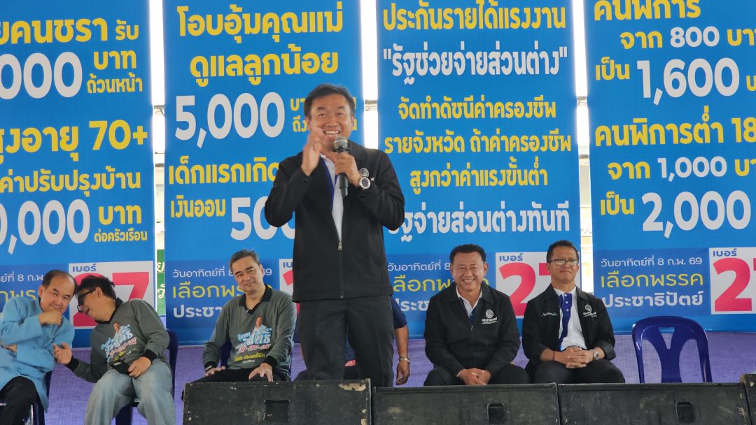 ทันทีที่เดินทางมาถึงเวที นายสัมพันธ์ ตั้งเบญจผล ตัวแทนประจำจังหวัด พรรคประชาธิปัตย์ ผู้สมัคร สส.บัญชีรายชื่อ ได้มอบเสื้อม่อฮ่อม ให้นายอภิสิทธิ์สวมทับเสื้อยืดปุ๋ยตราอภิสิทธิ์ สูตรสุจริต 100% สูตร 27-27-27 ทั้งนี้ได้เริ่มกล่าวปราศรัยถึงความตั้งใจแรกที่ตนกลับมาที่ จ.สุโขทัย คืออยากกลับมาทำให้บ้านเมืองสุจริต เพราะช่วงที่ตนไม่อยู่การเมือง เจอคนบ่นว่าการเมืองทุจริต มีการตกลงโดยประชาชนไม่รู้อยู่ตรงไหน พร้อมชูประเด็นการประกันราคาข้าว 10,000 บาท ถ้าขายได้ต่ำกว่า 10,000 บาท รัฐบาลจ่ายเงินเพิ่มให้ครบ 10,000 บาทต่อตัน และมีการจ่ายเงินช่วยต้นทุนตั้งแต่การเพาะปลูก 1,000 บาท เบี้ยคนชรารับทั่วถึง เท่าเทียม 1000 บาท โอบอุ้มคุณแม่ดูแลลูกน้อย 5000 บาท 12 เดือน และเงินออมตั้งแต่แรกเกิด- 18 ปี เดือนละ 500 บาท การให้เงินช่วยเหลือ 50,000 บาท สำหรับใช้ปรับปรุงบ้านให้ปลอดภัยสำหรับผู้สูงอายุ มีนโยบายเรียนฟรีจริง เรียนในสิ่งที่อยากเรียน สนับสนุนคูปองการศึกษา 3,000 บาทต่อปี โดยเน้นย้ำการคอร์รัปชันปัจจุบันที่ร้ายกว่าเดิม เพราะมีทุนเทามาจากสแกมเมอร์ หลอกลวงเอาเงินมาซื้ออำนาจเพื่อไม่ถูกดำเนินคดี ไม่ถูกจับ ที่สำคัญการรับเงินหนึ่งพันบาทที่ใครมาซื้อเสียงเราไป เขาจะไม่รู้สึกว่าเป็นหนี้บุญคุณเรา เพราะถือว่าจบกันไปแล้วด้วยเงิน แต่ประชาธิปัตย์ไม่ทำแบบนั้น เพราะเราต้องการเป็นหนี้ใจที่จะต้องกลับมาดูแลตลอดไป และพรรคประชาธิปัตย์จะไม่ทน ทุนเทา