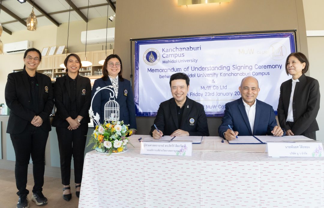 ผู้ช่วยศาสตราจารย์ ดร.ธัชวีร์ ลีละวัฒน์ รองอธิการบดีฝ่ายวิทยาเขตกาญจนบุรี พร้อมด้วยนายพันยศ โต๊ะทอง ประธานบริษัท บริษัท มู ว จำกัด ร่วมลงนามบันทึกข้อตกลงความร่วมมือ (Memorandum of Understanding: MOU) ด้านวิชาการ การวิจัย การพัฒนานวัตกรรม และการพัฒนาทรัพยากรมนุษย์ ตลอดจนการขับเคลื่อนกิจกรรมที่ก่อให้เกิดประโยชน์ต่อสังคม ชุมชน และการพัฒนาที่ยั่งยืนร่วมกัน ความร่วมมือระหว่างมหาวิทยาลัยและบริษัทเอกชน เพื่อมุ่งเน้นการพัฒนาและสนับสนุนกิจกรรมที่ช่วยเสริมสร้างสุขภาวะของคนในชุมชนอย่างครบวงจร อาทิ การส่งเสริมองค์ความรู้ด้านสุขภาพ การออกแบบพื้นที่เรียนรู้และพื้นที่สร้างสรรค์ที่เอื้อต่อสุขภาวะ การพัฒนานวัตกรรมหรือผลิตภัณฑ์ที่เชื่อมโยงกับสุขภาพและคุณภาพชีวิต ตลอดจนการสนับสนุนกิจกรรมทางสังคมและเศรษฐกิจชุมชนที่ช่วยเพิ่มรายได้ ควบคู่ไปกับการดูแลสิ่งแวดล้อมและทรัพยากรท้องถิ่นอย่างยั่งยืน ทั้งนี้ แนวคิด Wellbeing (สุขภาวะองค์รวม) ดังกล่าวจะถูกบูรณาการเข้ากับการเรียนการสอน การวิจัย และการบริการวิชาการ เพื่อให้เกิดการเรียนรู้จากสถานการณ์จริงและตอบโจทย์ความต้องการของพื้นที่อย่างแท้จริง
