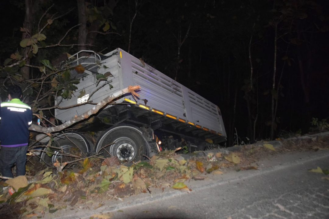 สถานีตำรวจภูธรแม่ลาน้อย จังหวัดแม่ฮ่องสอน ได้รับแจ้งจากชาวบ้านทุ่งรวงทอง ตำบลท่าผาปุ้ม อำเภอแม่ลาน้อย ว่าเกิดอุบัติเหตุรถบรรทุกพ่วง 18 ล้อ เสียหลักลงข้างทาง บนทางหลวงหมายเลข 108 ช่วงระหว่างบ้านทุ่งรวงทอง – อำเภอแม่ลาน้อย จังหวัดแม่ฮ่องสอน ห่างจากโรงเรียนราชประชานุเคราะห์ที่ 21 ไปเพียงเล็กน้อย จากการตรวจสอบในที่เกิดเหตุ พบว่ารถบรรทุกพ่วง 18 ล้อ ขณะขับลงเนินได้เสียหลักพุ่งลงข้างทาง ก่อนชนอัดกับต้นไม้ใหญ่ริมทางอย่างรุนแรง สภาพรถได้รับความเสียหายหนัก และเกือบตกลงเหวซ้ำ โชคดีที่ต้นไม้ช่วยค้ำยันเอาไว้ มีผู้บาดเจ็บ 1 รายเป็นชาย ซึ่งเป็นคนขับรถได้รับบาดเจ็บสาหัส และติดอยู่ภายในซากรถ ไม่สามารถออกมาได้ด้วยตนเอง เจ้าหน้าที่กู้ภัยแม่สะเรียงจึงเข้าทำการช่วยเหลืออย่างเร่งด่วน พร้อมประสานกู้ภัยขุนยวมสนับสนุนอุปกรณ์ตัดถ่าง