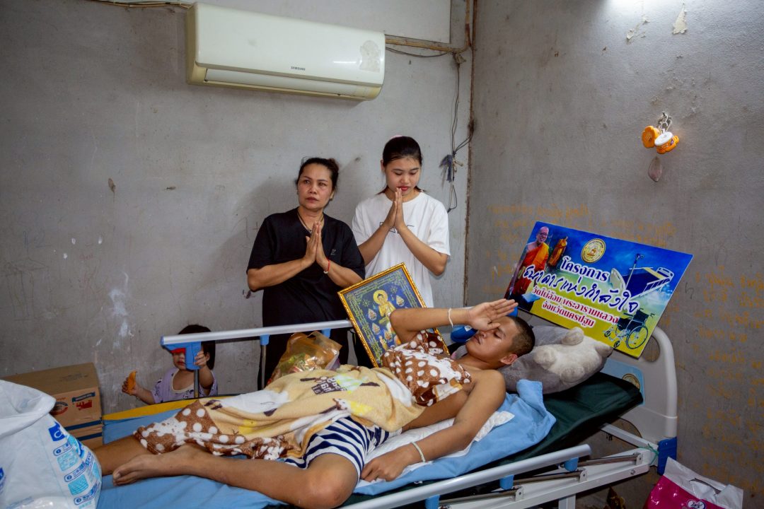 น.ส.ธมลวรรณ บอกว่า ปกตินายโชคชัย และตนเองจะทำงานอยู่ที่โรงงานดังกล่าวโดยใช้ชีวิตอยู่ในห้องนี้ โดยจะต้องเช่าบ้านอยู่เดือนละ 400 บาท และจ่ายค่าใช้ไฟไฟฟ้าตามจำนวนที่ใช้จริง ซึ่งเหตุการณ์เกิดขึ้นเมื่อวันที่ 4 มกราคมที่ผ่านมา เมื่อนายโชคชัย (สามี) ได้ขับขี่จักรยานยนต์ออกจากบ้านเพื่อจะทำงาน แต่ห่างเพียงไม่กี่เมตรก็ได้พลาดเกิดอุบัติเหตุรถล้ม ทำให้ศีรษะกระแทกพื้นอย่างแรง และนอนแน่นิ่งไป ตนเองจึงได้ประสานคนในโรงงานให้ช่วยตามรถพยาบาลให้นำไปส่งที่โรงพยาบาล ในเบื้องต้นแพทย์ที่โรงพยาบาลกำแพงแสน ได้ทำการเอ็กซเรย์ พบว่ากะโหลกศีรษะด้านขวาร้าว และมีเลือดออกในเยื่อหุ้มสมอง จึงได้นำตัวเร่งส่งมาที่โรงพยาบาลนครปฐม เพื่อทำการผ่าตัด อย่างเร่งด่วนเนื่องจากอยู่ในสภาวะวิกฤต กระทั่งวันที่ 5 มการาคม จึงได้ประสานไปยังมารดาของสามีเพื่อให้มาช่วยดูอาการ ซึ่งพบว่าตอนนั้นยังมีอาการวิกฤติ กระทั่งเมื่อการผ่าตัดผ่านพ้นไปและได้ให้กลับมาพักฟื้นที่บ้าน ก็มาเกิดปัญหาเกี่ยวกับการจัดหาเตียงสำหรับผู้ป่วย เนื่องจากตนเองไม่มีเงินเก็บและนายโชคชัยก็เป็นหัวเรือหลักในการหารายได้เข้าบ้าน ตนเองจึงขอให้มารดาของสามีมาช่วยดูแลทั้งนายโชค และน้องแก้ว บุตรของตนเอง โดยที่ตนเองจะออก ไปทำงานที่โรงงานเพื่อนำรายได้เข้าที่บ้านเดือนละ 12,000 บาท สำหรับการใช้ชีวิตสี่ชีวิต ที่มีผู้ป่วยและเด็กเล็กหนึ่งคน “หนูได้หาข้อมูลว่าที่ไหนจะมีเตียงสำหรับผู้ป่วยให้สามีได้นำมาใช้บ้าง จึงได้ ประสานไปยังเจ้าหน้าที่ อสม. เพื่อติดตามหาเตียง และมีคนบอกว่าที่วัดไผ่ล้อมฯ โครงการแจกเตียงอยู่ หนูก็ได้นั่งรถตู้ประจำทางและสอบถามเส้นทางคนจนกระทั่งมาพบกับเจ้าหน้าที่ที่วัดไผ่ล้อมฯ โดยได้ทำเรื่องขอเตียง และไม่คิดว่าหลวงพี่น้ำฝนจะนำเตียงมาให้อย่างรวดเร็ว ทำให้รู้สึกซาบซึ้งและขอขอบคุณในเมตตาที่มีให้ครอบครัวของเรา” น.ส.ธมลวรรณ กล่าว