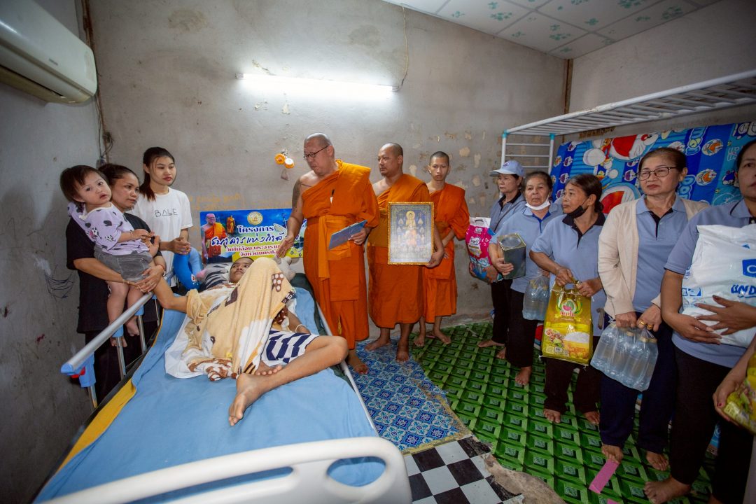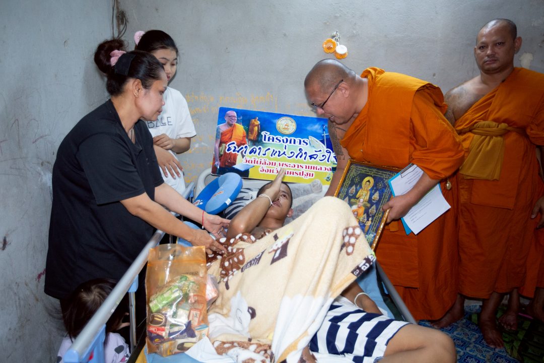 หลังรับทราบข้อมูล หลวงพี่น้ำฝน ได้นำคณะสงฆ์ลงพื้นที่เพื่อนำเตียงสำหรับผู้ป่วย พร้อมด้วยข้าวสารอาหารแห้งและอุปกรณ์ยังชีพที่จำเป็น ไปยังบ้านเลขที่ 129หมู่ 12 ตำบล ห้วยม่วง อำเภอ กำแพงแสน จังหวัด นครปฐม ซึ่งมีพื้นที่เป็นห้องเช่าเล็กๆ อยู่ในภายในโรงงาน โดยพบนายโชคชัย กันทะมัง อายุ 25 ปี นอนพักร่างกายอยู่ในห้องพักซึ่งมีที่นอนตั้งอยู่กับพื้นโดยใช้ไม้รองพื้น พาเลท สลับเคลื่อนย้ายสินค้าเป็นตัวรองพื้น ซึ่งมีนางพรรณี อุรัตน์ อายุ 47 ปี มารดา ที่ได้อุ้มน้องแก้ว (นามสมมติ) อายุ 1 ขวบครึ่ง บุตรสาวของนายโชคชัย อยู่ร่วมกันภายในบ้าน โดยมีเจ้าหน้าที่ อสม.ตำบลห้วยม่วง มาช่วยดูแลอาการป่วย และเป็นที่น่าเวทนาเนื่องจากในห้องเล็กๆต้องอาศัยกันอยู่ 4 ชีวิต เพื่อต่อสู้ กับวิกฤตที่เกิดขึ้นในช่วงนี้