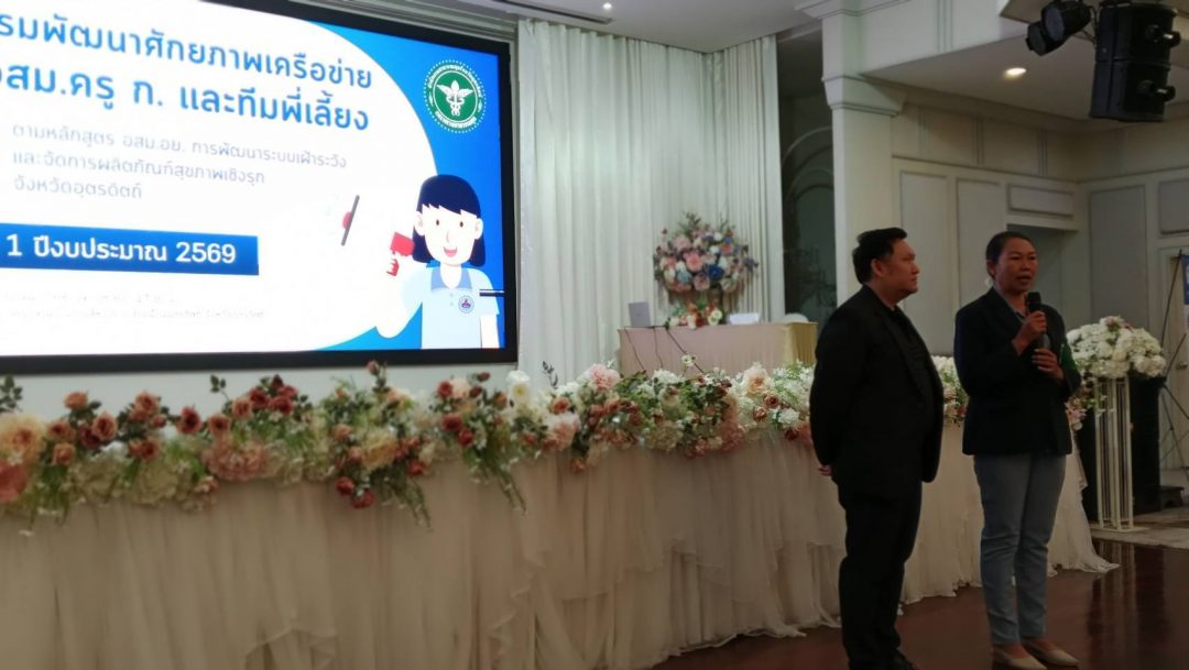 ที่ห้องประชุมบอลรูม โรงแรมสีหราช อำเภอเมืองอุตรดิตถ์ จังหวัดอุตรดิตถ์ โดย นายเสมอเทพ แว่นวิชัย เภสัชกรชำนาญการ สสจ.อุตรดิตถ์พร้อมด้วยอาสาสมัครสาธารณสุขประจำหมู่บ้าน(อสม.) เจ้าหน้าที่พี่เลี้ยงทุกอำเภอ และผู้เกี่ยวข้อง จำนวนรวมทั้งสิ้น 200 คนเข้าร่วมโครงการพัฒนสเครือข่ายศักยภาพเครือข่ายอสม.ครู ก.และทีมพี่เลี้ยงตามหลักสูตร อสม.อย. การพัฒนาระบบเฝ้าระวังและจัดการผลิตภัณฑ์สุขภาพเชิงรุก รุ่นที่ 1ปีงบประมาณ 2569 ภายใต้โครงการพัฒนาระบบผลิตภัณฑ์สุขภาพเพื่อสุขภาวะที่ดีของประชาชนปึงบประมาณ 2569